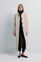 - Crafted from a wool-alpaca-silk blend, this collarless coat features kangaroo pockets and soft lines. Handmade and unlined for quiet elegance.