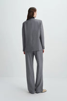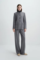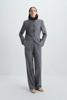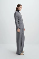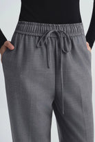 Wool-blend pant with drawstring waist and relaxed silhouette, offering casual ease balanced with refined tailoring for modern wear.