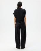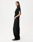 Mid-rise barrel pants in non-stretch, coated black denim, manufactured in LA. This jean is relaxed through the hip and leg and has darts at the knee. Complete with a five pocket style, detailed with nail head rivets, belt loops, zip fly and metal shank at the waistband.