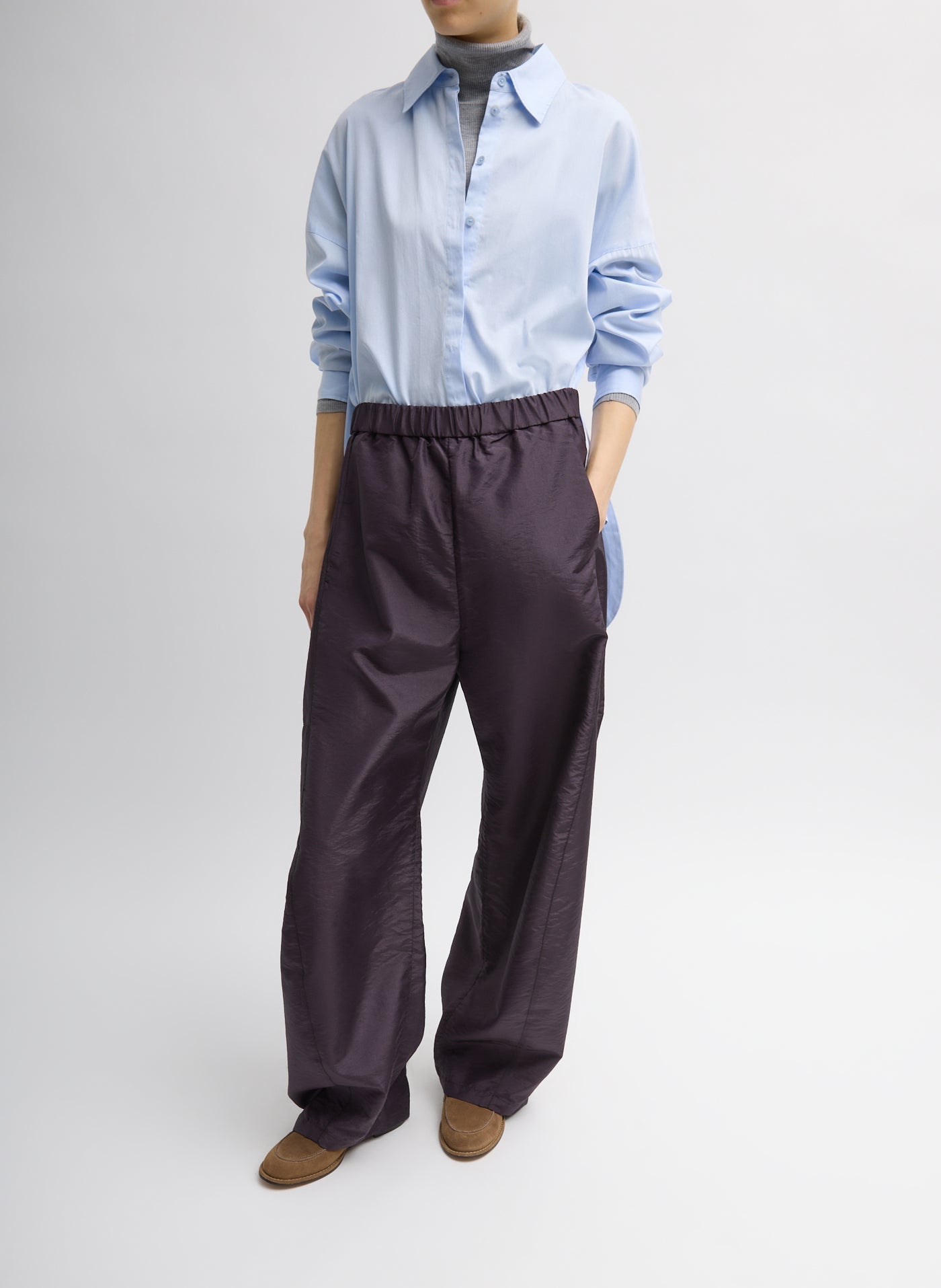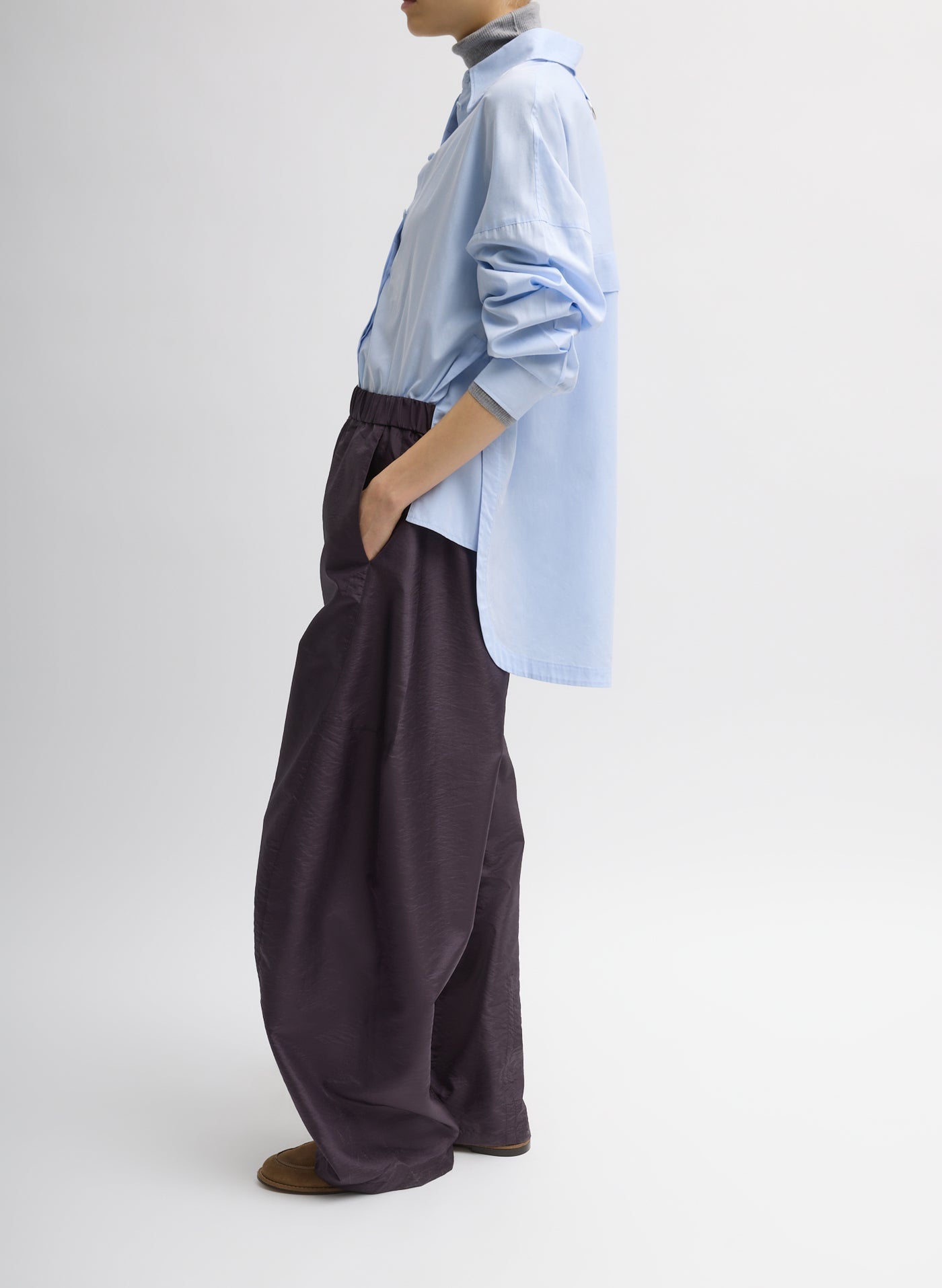 This assortment serves as your WOFs (Without Fails) and are designed to create space in your wardrobe for creativity and experimentation. No matter how extreme your closet may become, these pieces serve as the grounding element that ties everything together. Featuring hem snaps for temporary alterations, the Crispy Nylon Winslow Pant offers pragmatic design with elevated details. Its Italian nylon fabrication comes in Black, Navy, and Eggplant, making it a standout option for creative and pragmatic outfitting.