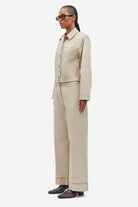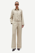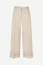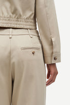 Mid-waist trousers with a regular fit and straight leg. Hidden hook and zipper closure at the fly. Adjustable elastic waistband on the inside. Side slit pocket on the front and single button welt pocket at the back. Belt loops. Fold up at the cuffs. Main material made from an elastic blend of organic cotton.