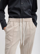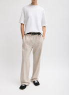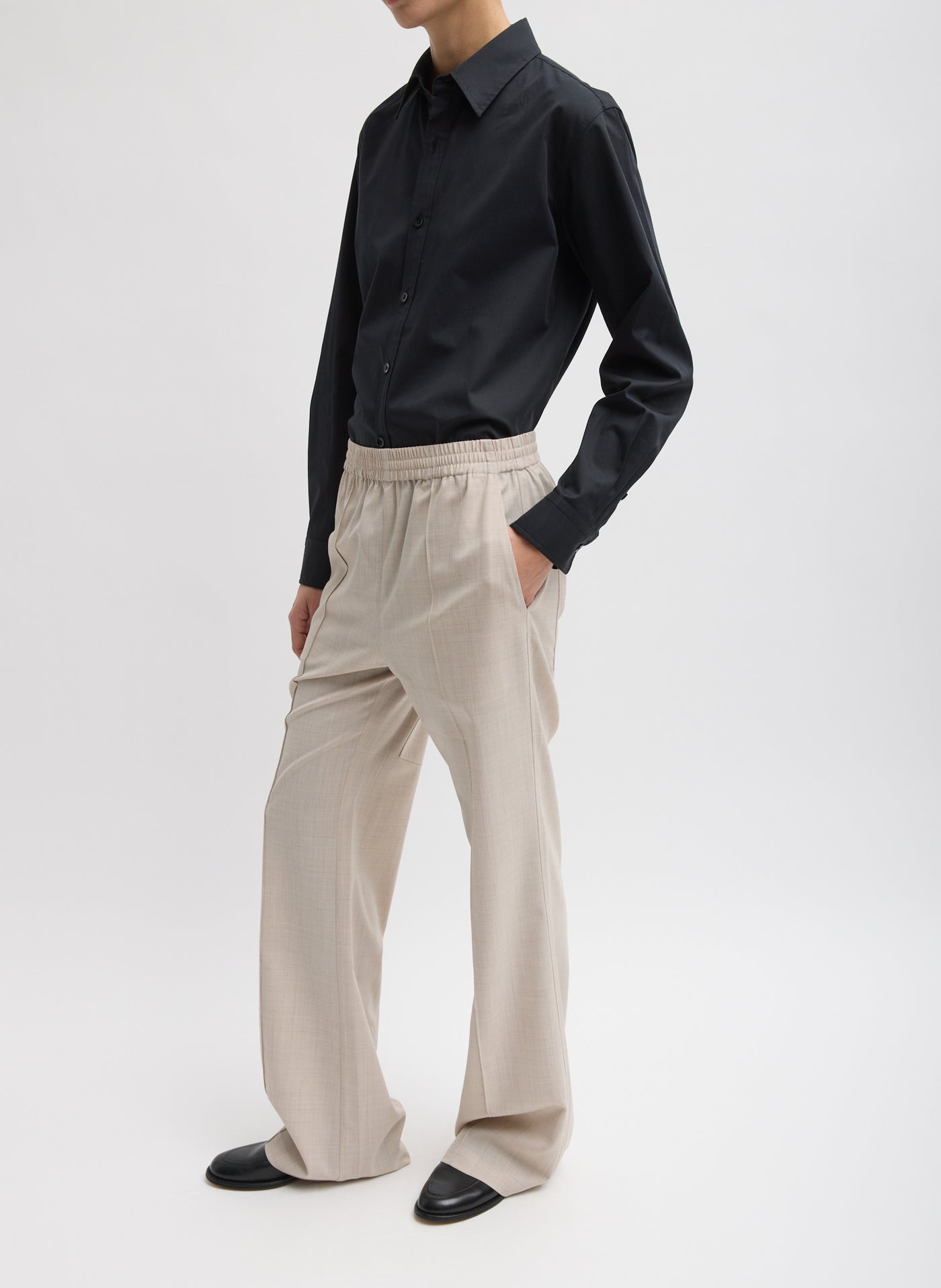 This assortment serves as your WOFs (Without Fails) and are designed to create space in your wardrobe for creativity and experimentation. No matter how extreme your closet may become, these pieces serve as the grounding element that ties everything together. An all-season favorite reimagined in Tibi’s signature Tropical Wool, the Scottie Jogger now features a hidden snap at the hem—allowing you to adjust the length depending on your shoe or setting. Designed with an elastic waistband, drawstrings, and belt loops, it delivers on both comfort and customization. An everyday staple for those who want tailoring—without the tailoring.