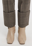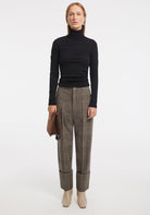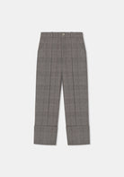 Our WENDERS straight-leg suiting pants are made a soft wool blend. Featuring a subtle checkered pattern, this versatile silhouette is defined by its sharp front pleats and exaggerated, cuffed hems, adding a tailored yet relaxed structure to the everyday work wardrobe.