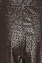 WIDE LEG 5 POCKET PANTS DARK BROWN ARE DESIGNED WITH A WIDE-LEG SILHOUETTE AND A QUILTED TEXTURE. THE STYLE FEATURES BELT LOOPS, SIDE AND BACK POCKETS. MATCHES WITH CROPPED PUFFER JACKET DARK BROWN.