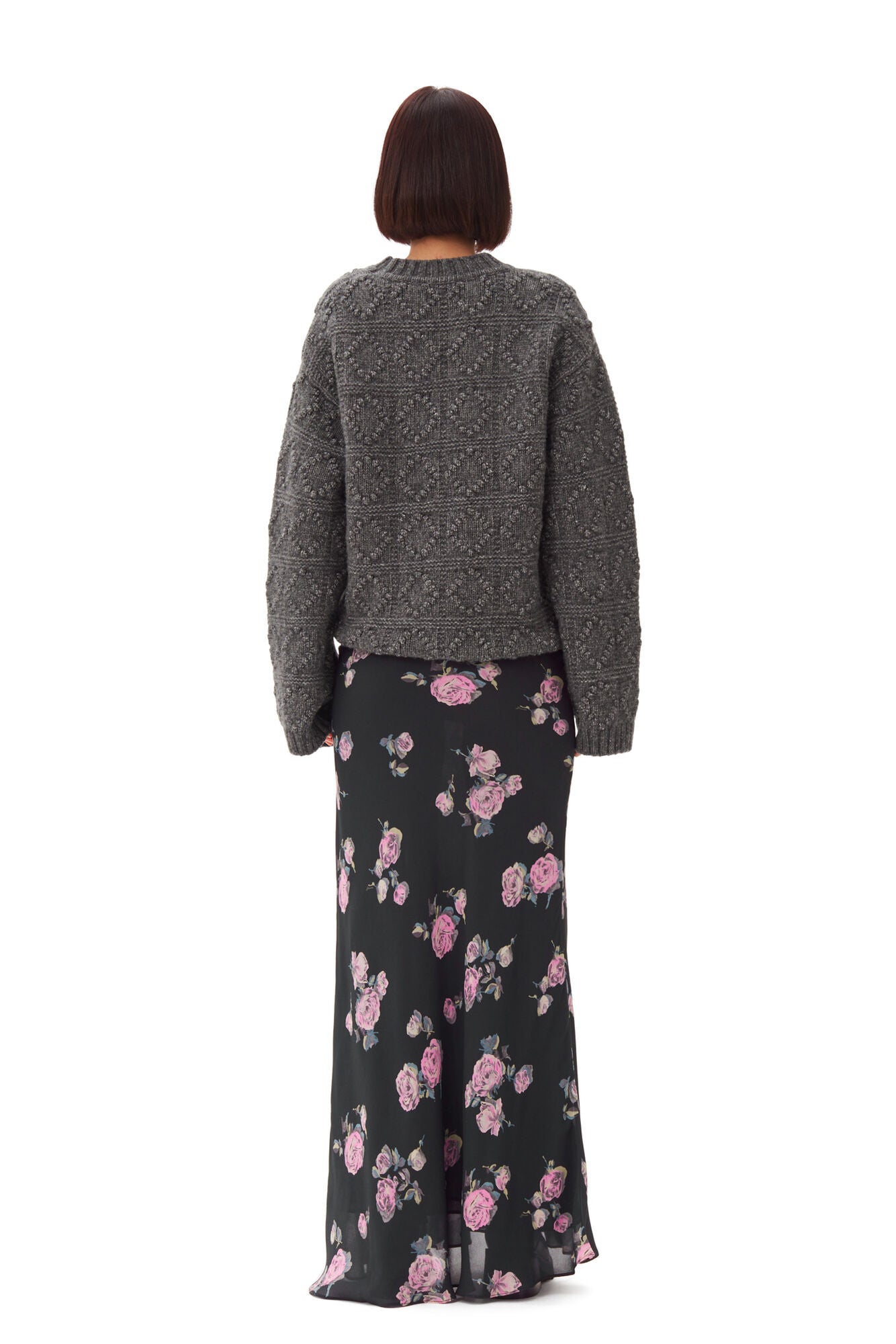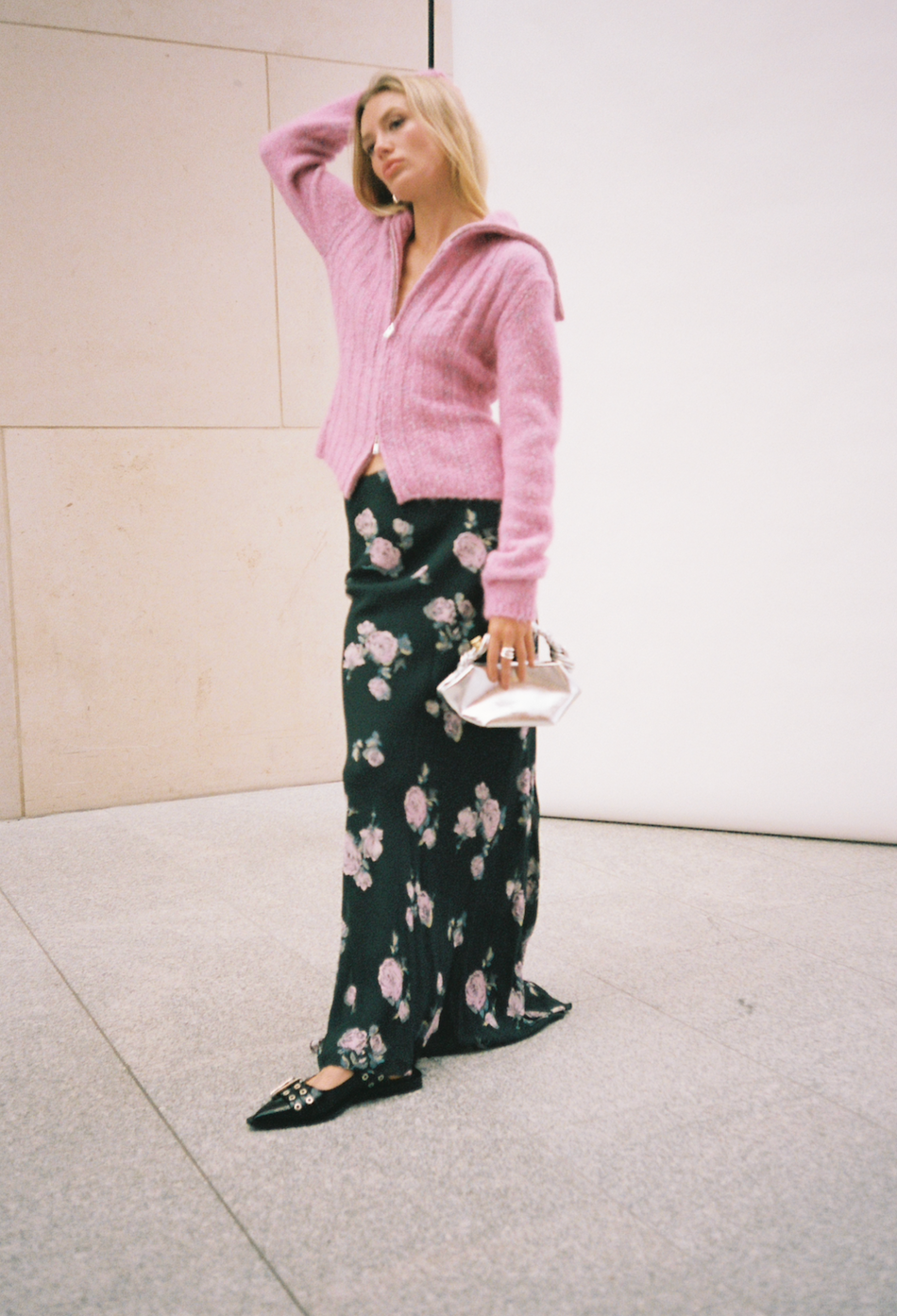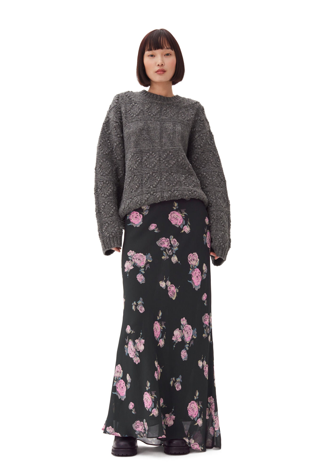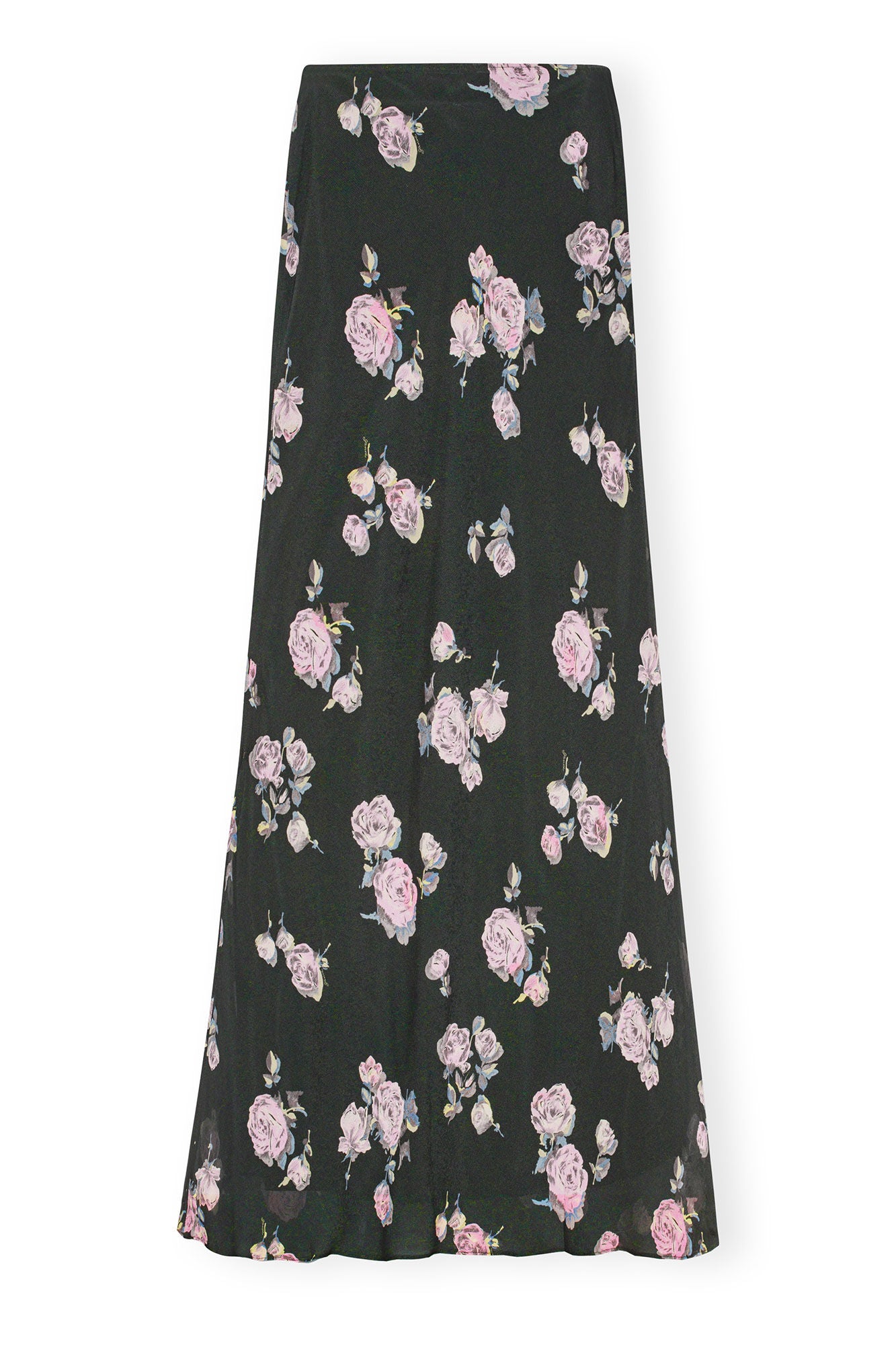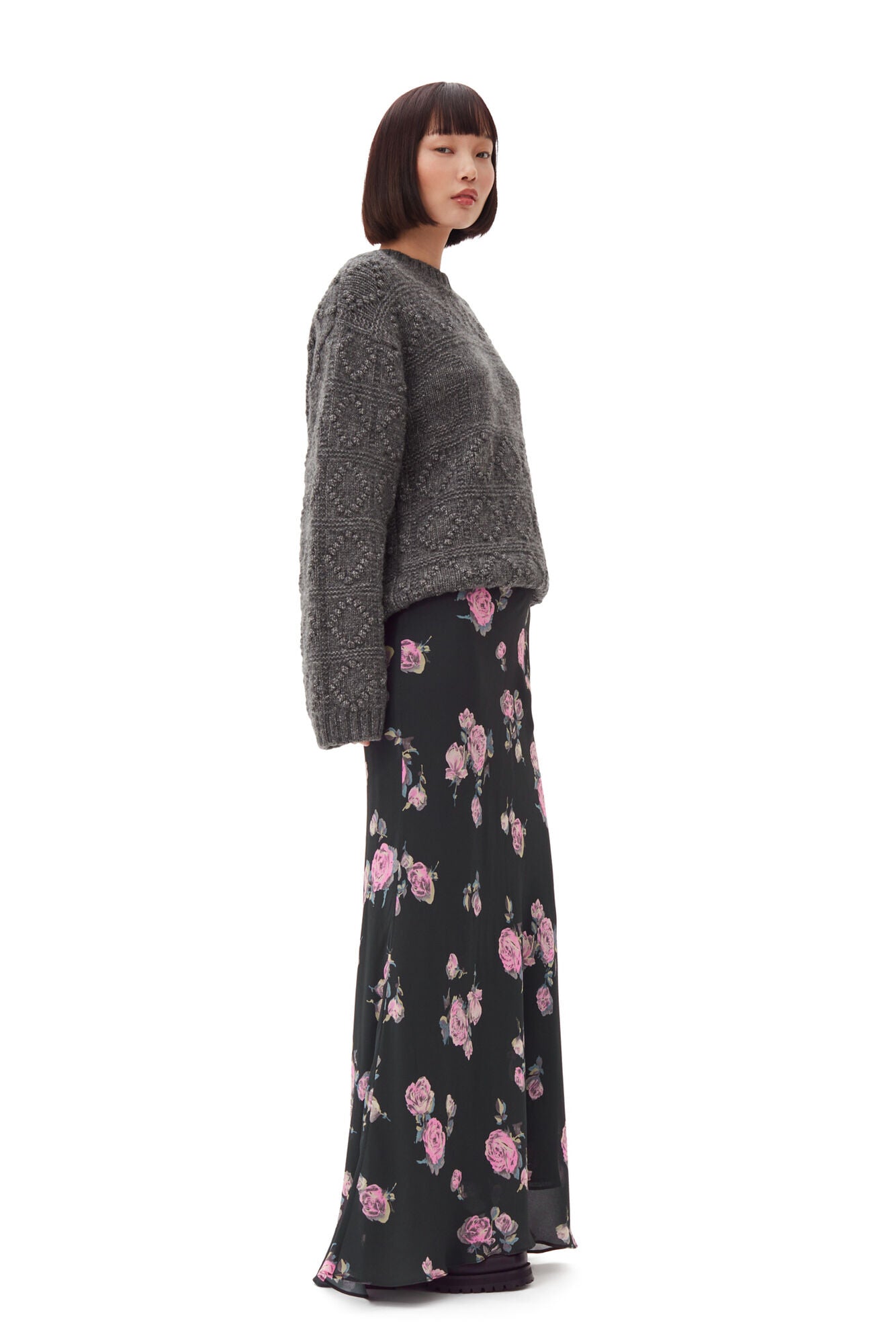 This Floral Printed Crepe Maxi Skirt features a zip closure at the side and a pink floral print.