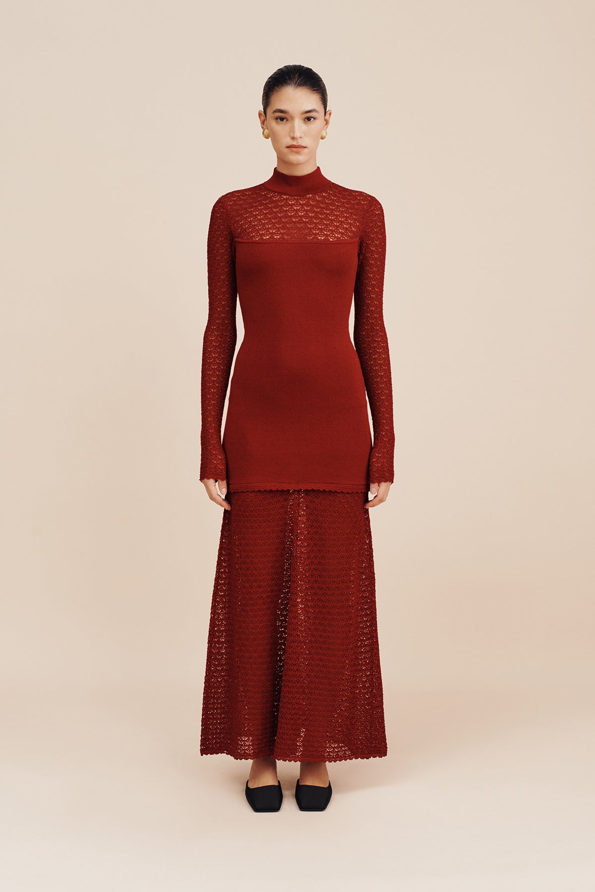 Our antique-inspired Romy High Neck Dress is crafted from the softest viscose blend in a crochet knit. Designed for a close fit, it features an elegant high neckline, full-length sleeves and a floaty hem adorned with scalloped trims.