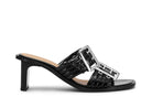 These Black Feminine Buckle Heeled Mule Sandals feature large metallic buckles, slip-in style and an open-toe.