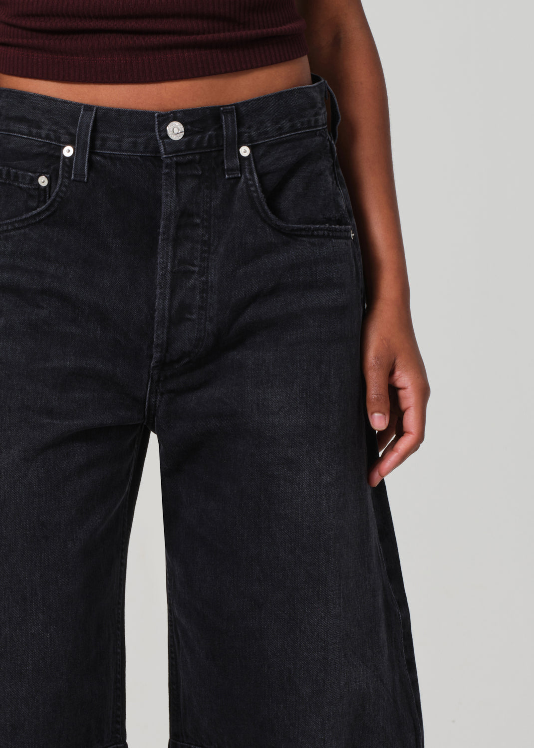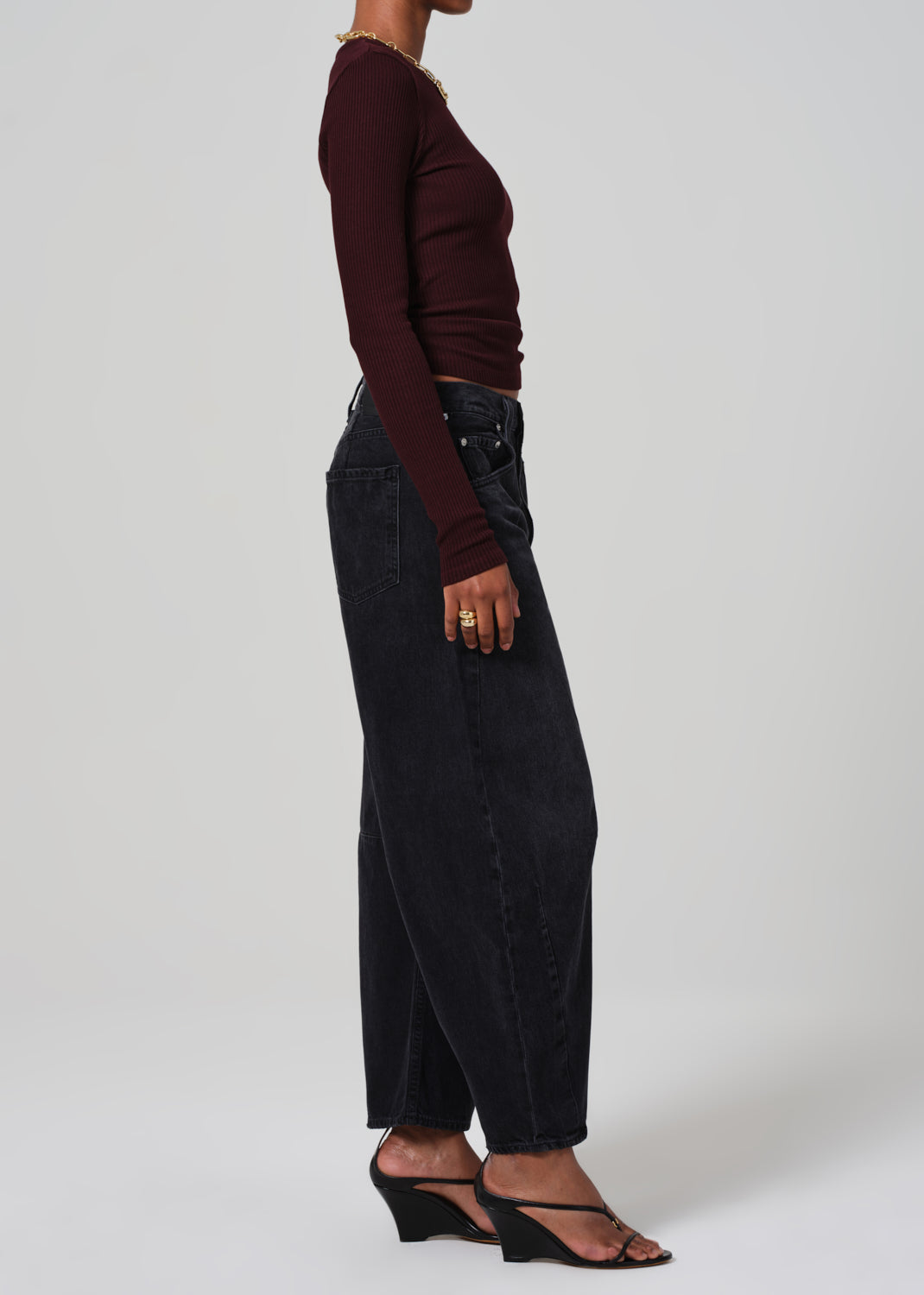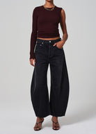 Aptly named, the Horseshoe jean is fashioned with a curved, wide leg that falls to slightly tapered and cropped, frayed hems. This oversized silhouette looks great with a sleek tank.