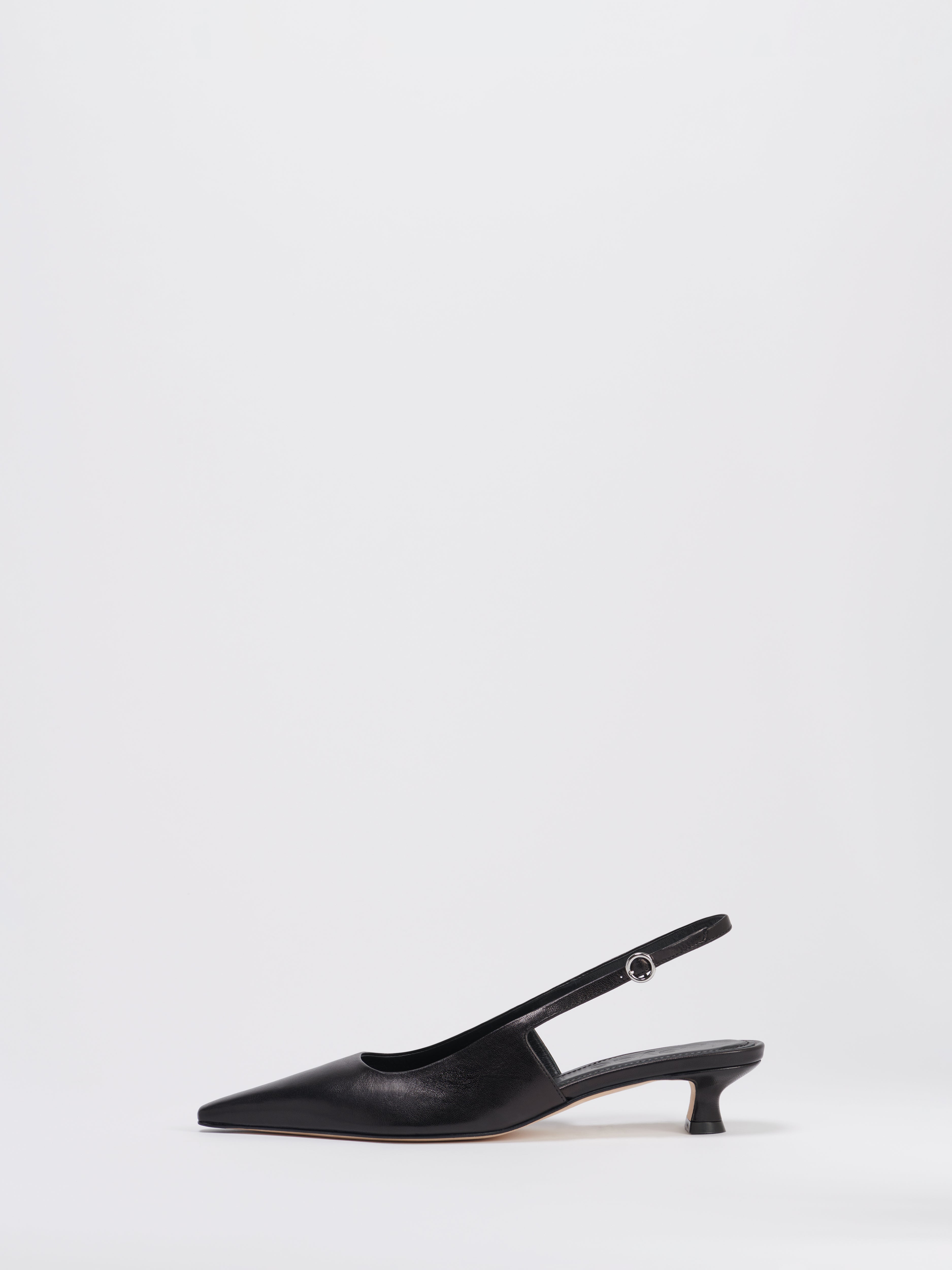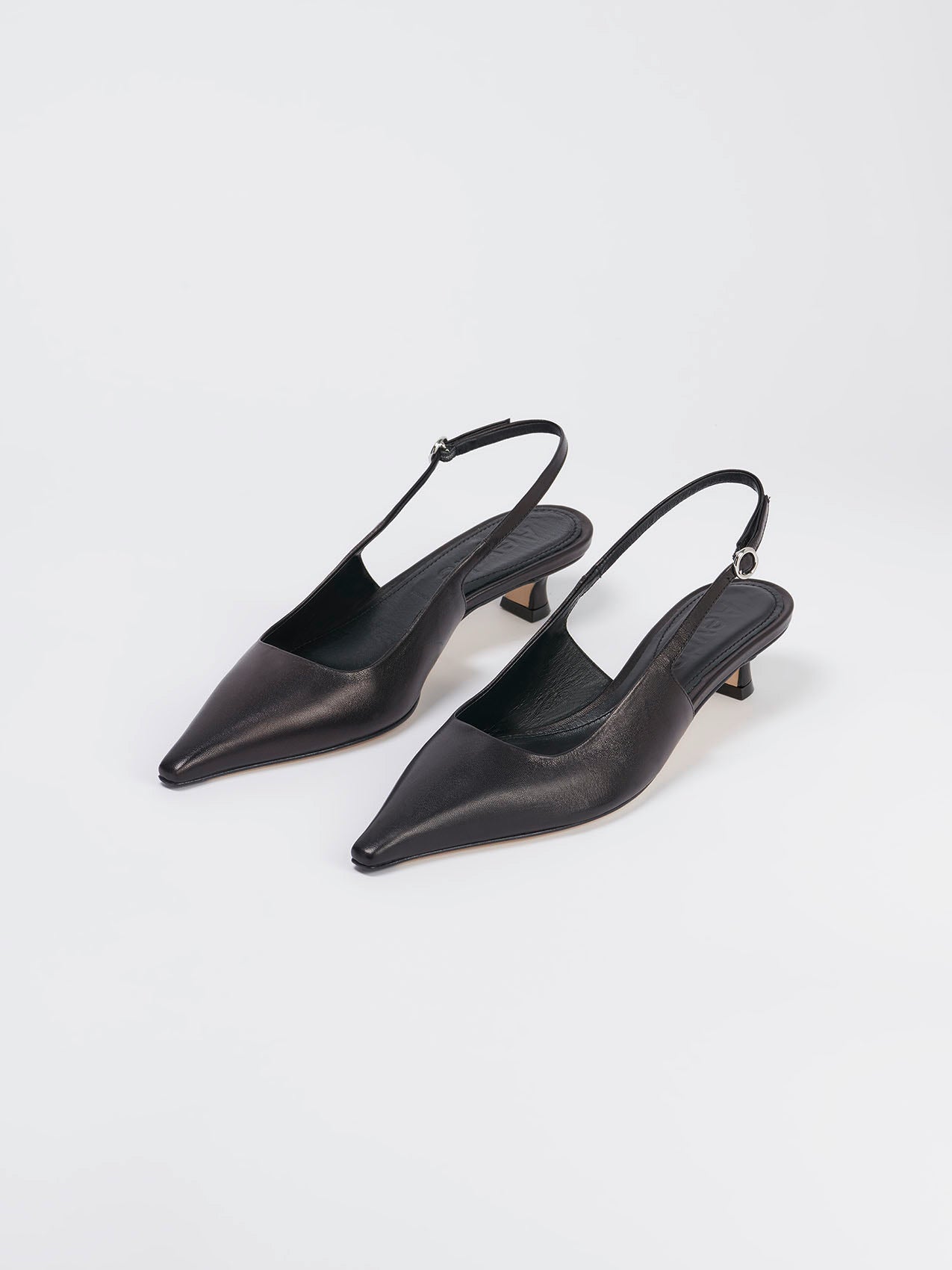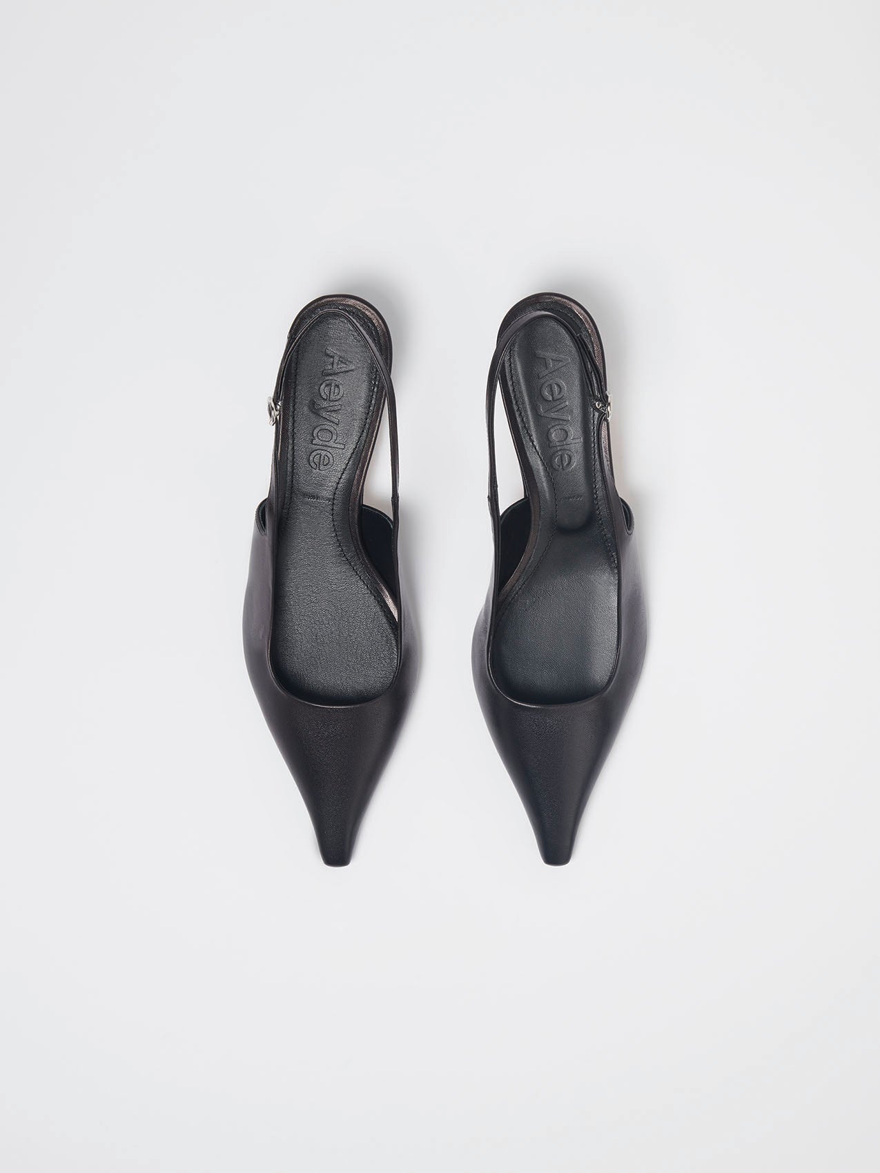 Catrina are Aeyde's elegant chisel-toe pumps featuring tapered kitten heels, adjustable slingback straps, and bespoke anti-slip soles.