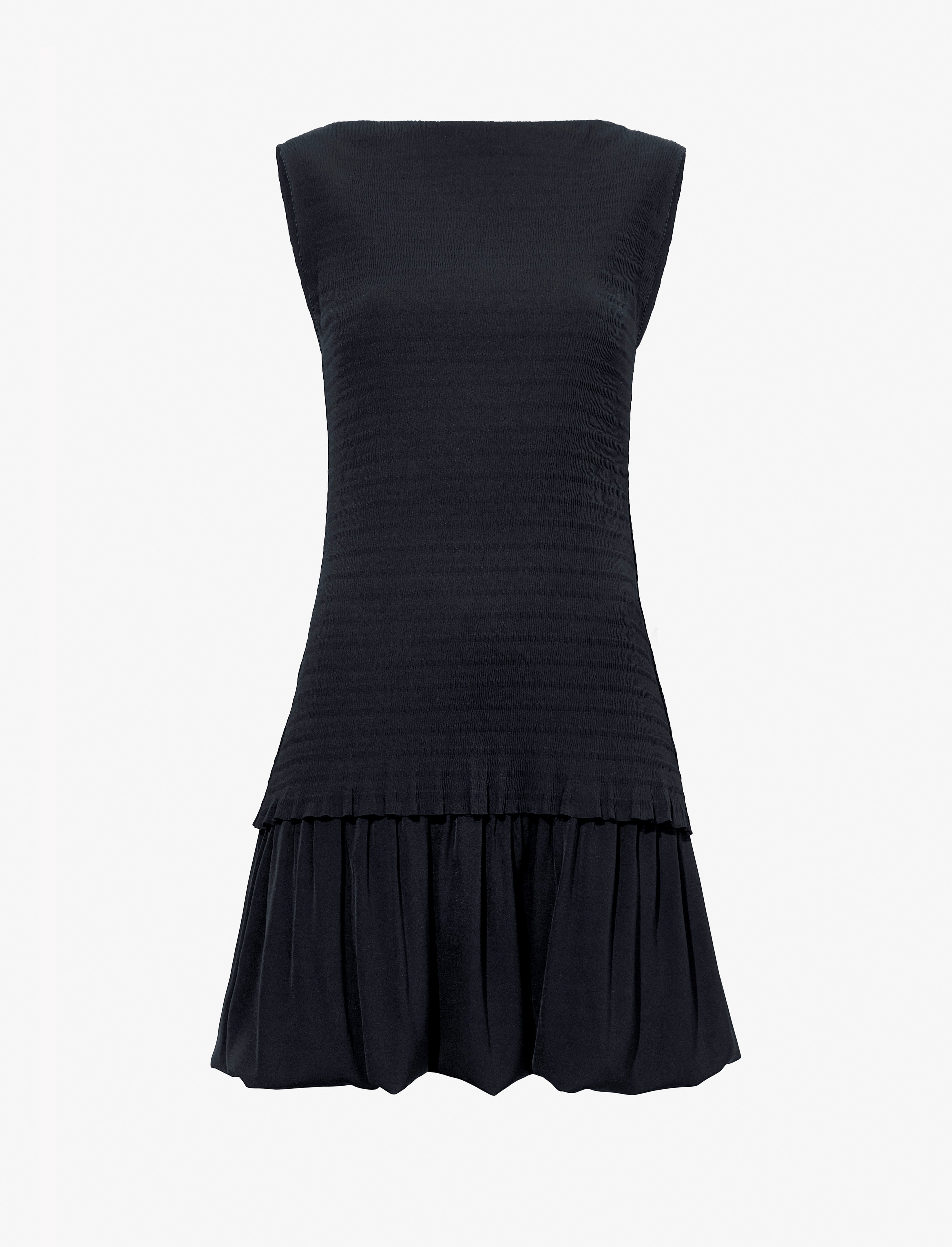The Martine Dress in Micro Pleat is designed for a slim fit on the body and detailed with a wide boat neckline. This dress falls to a mini length over a solid pleated hem for a layered appearance.