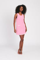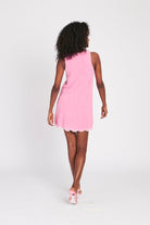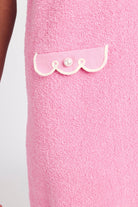 - Pink knit terry mini shift dress with contrast ivory trim