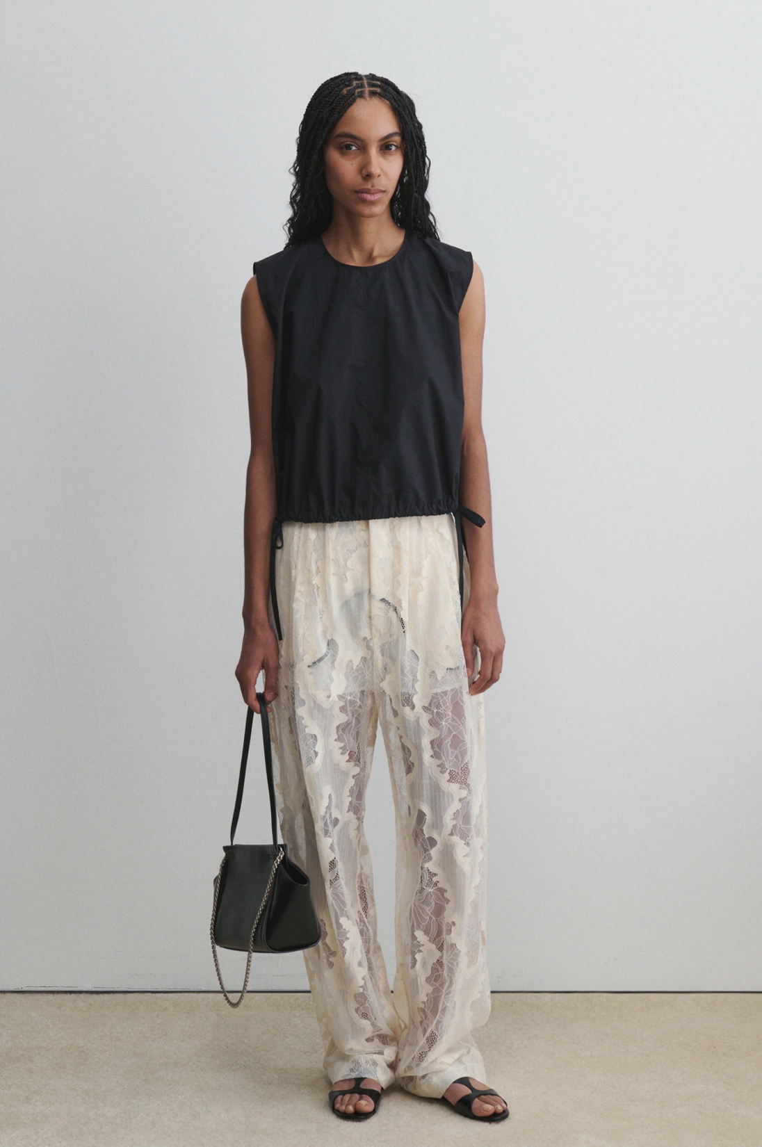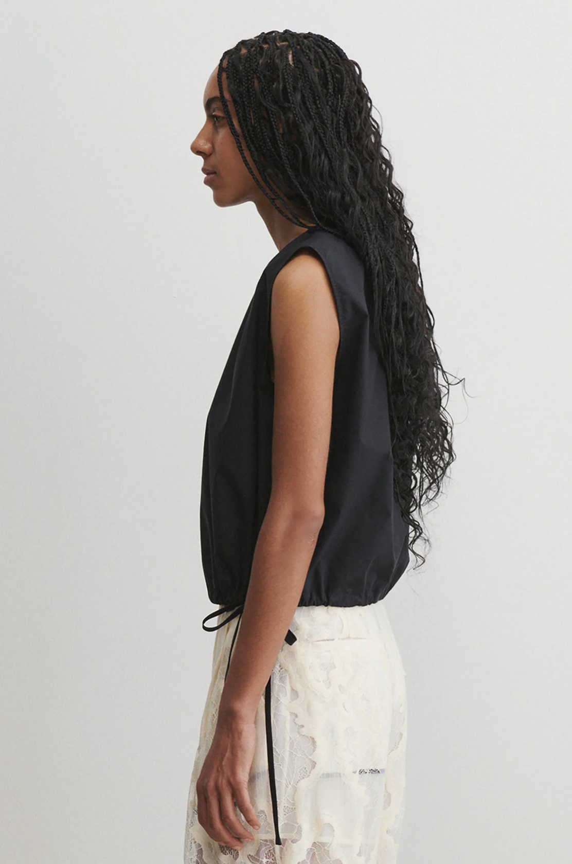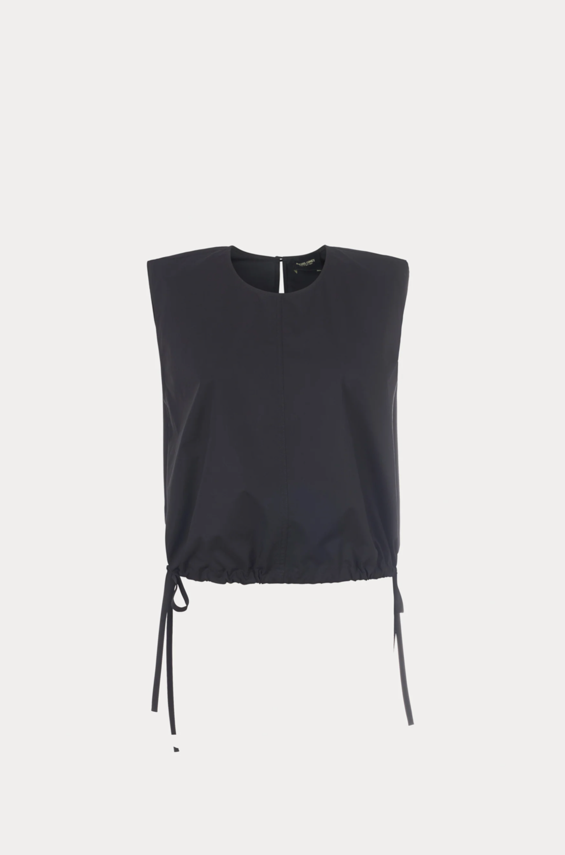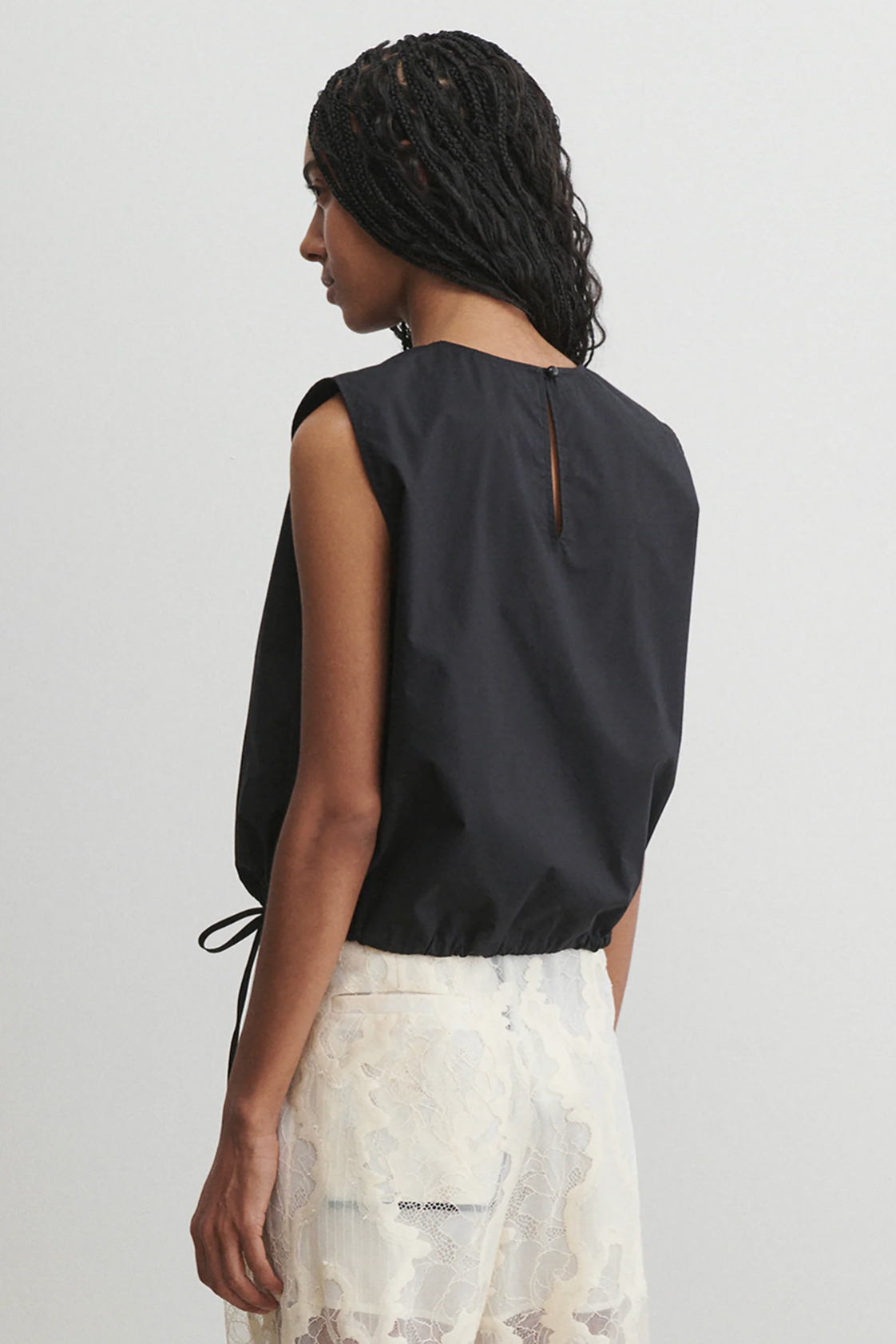 Sleeveless round neck top cut from crisp cotton. Finished with a drawsting at the hem.