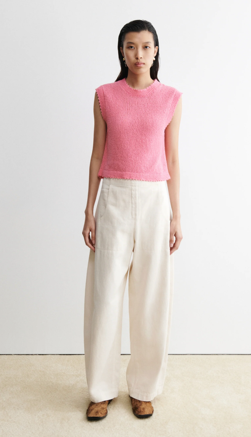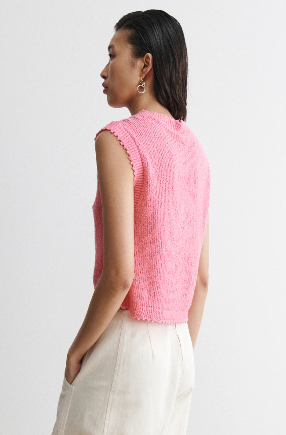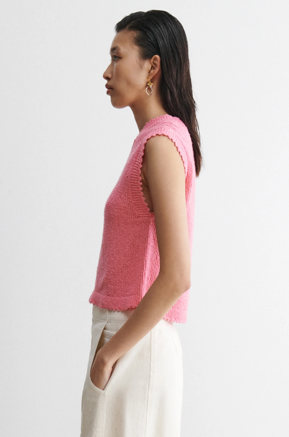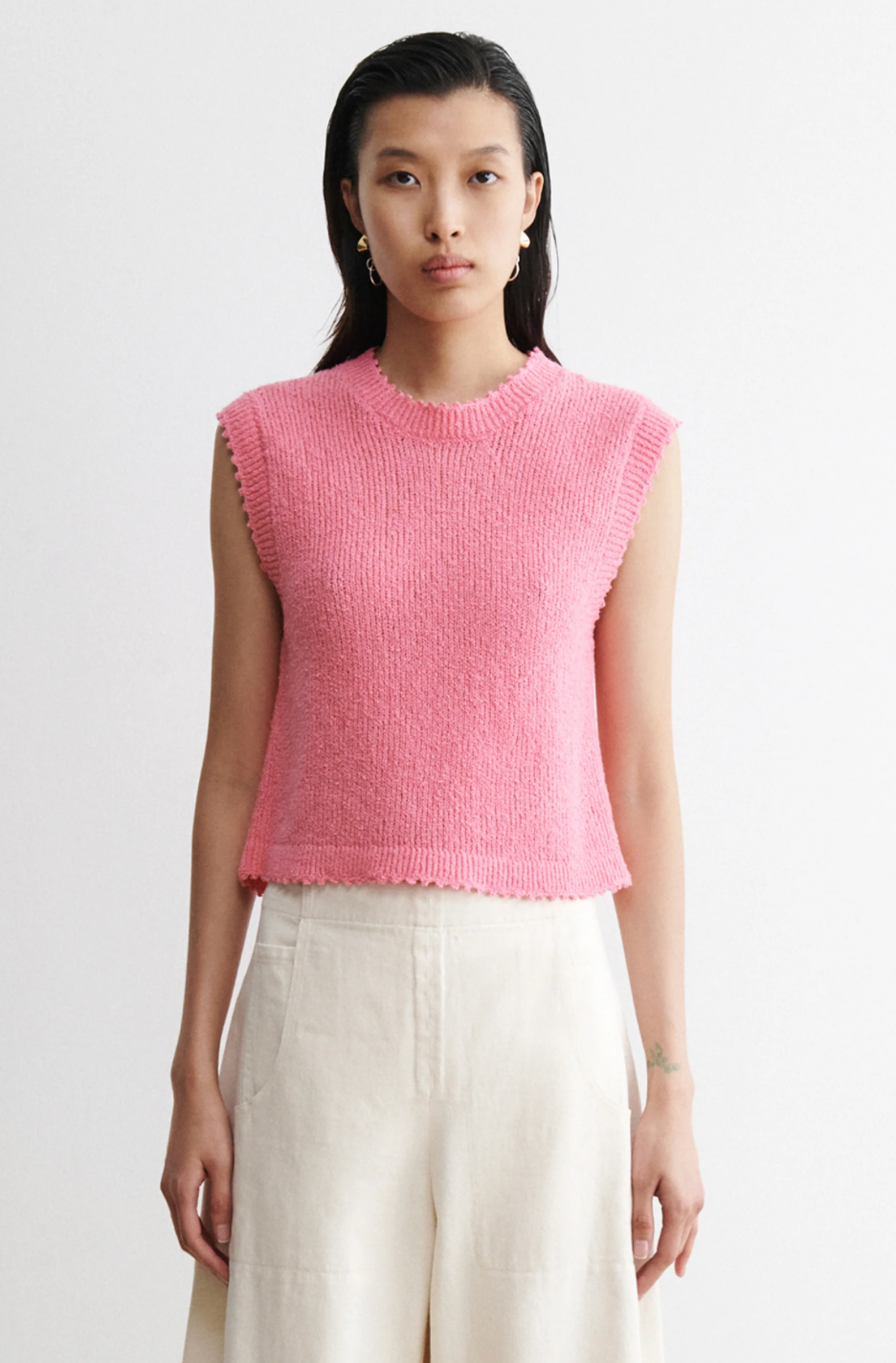 Sleeveless crewneck top with ribbed and hand crocheted picot trim, in our signature Cotton Boucle—a lightweight, textured knit, spun for summer basics.