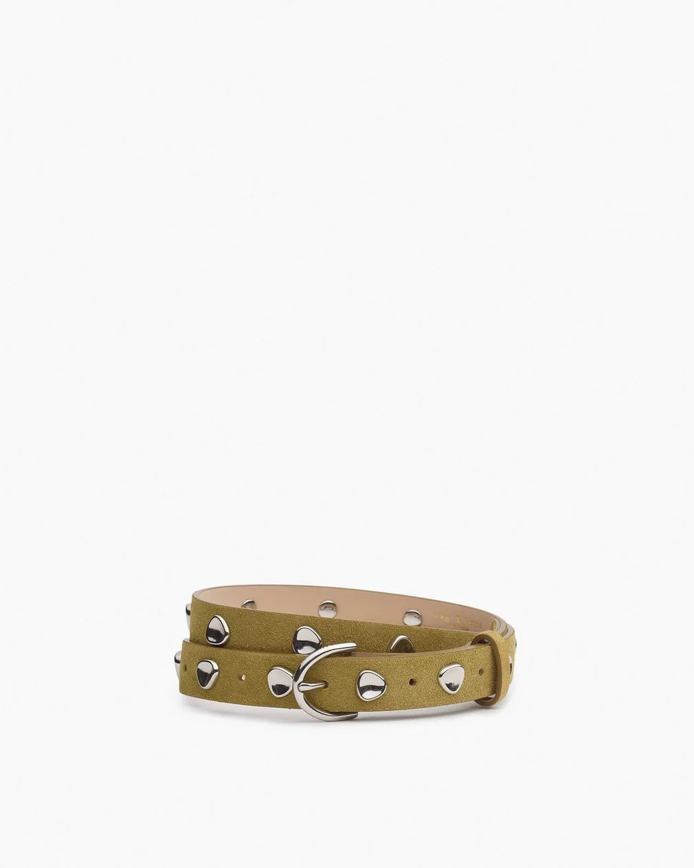 Classic edge. Crafted in Italian-milled leather, this streamlined belt features oblong pebble-shaped studs inspired by forms from fine jewelry. It fastens with a simple curved metal buckle.