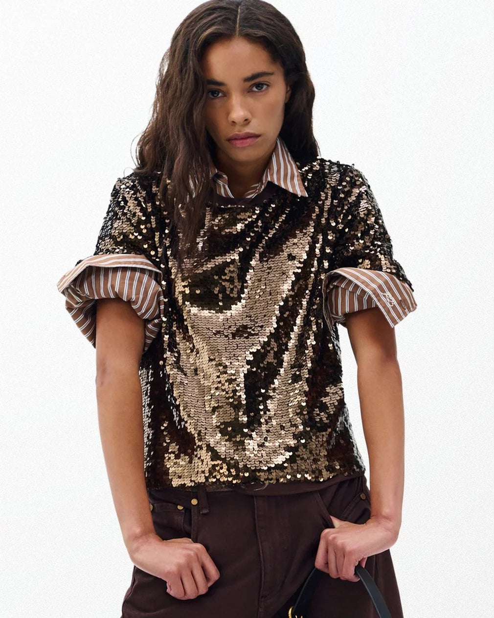 Something special. This sequin top is cut for a relaxed fit and lined with mesh for comfort. Here just in time for effortless dressing up this party season. Machine washable.
