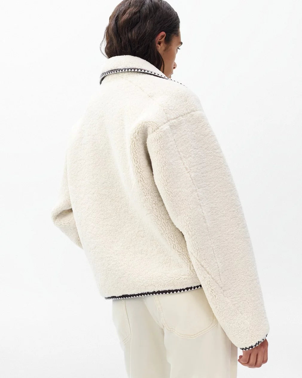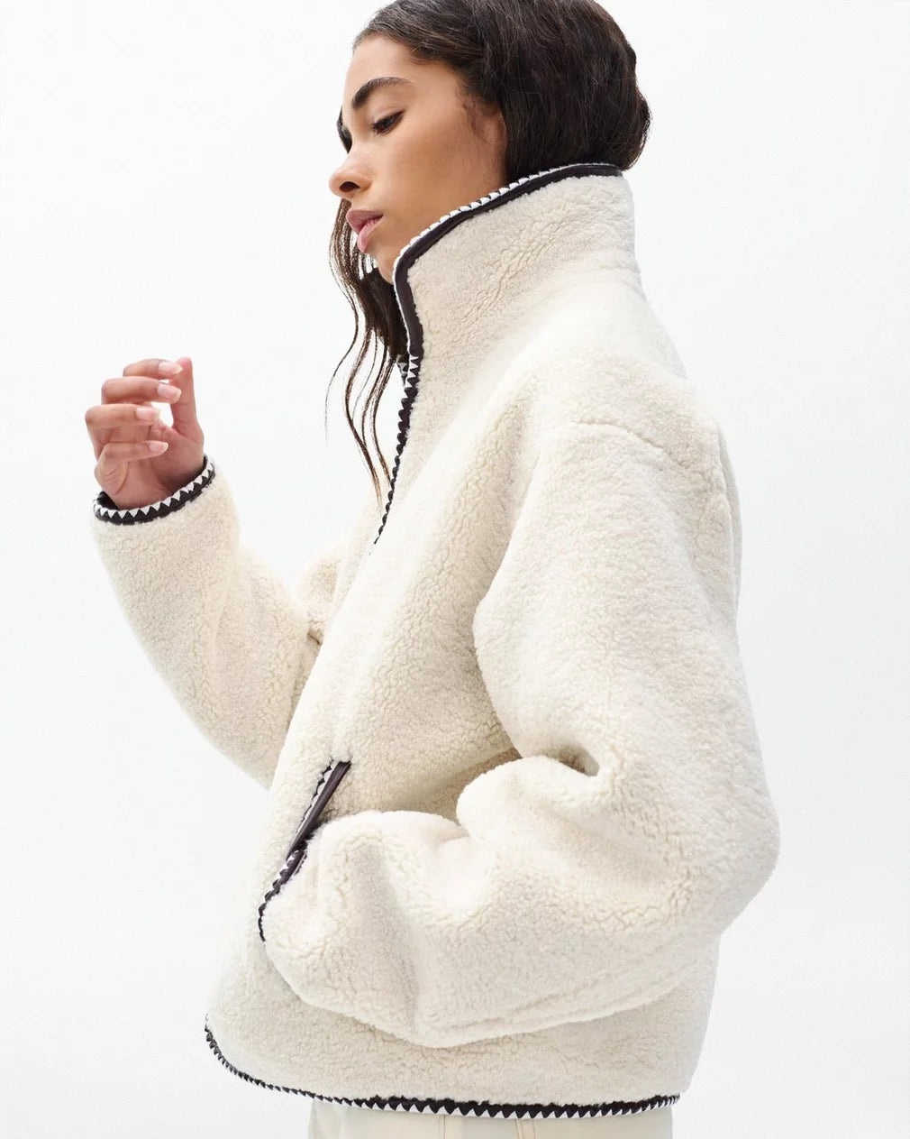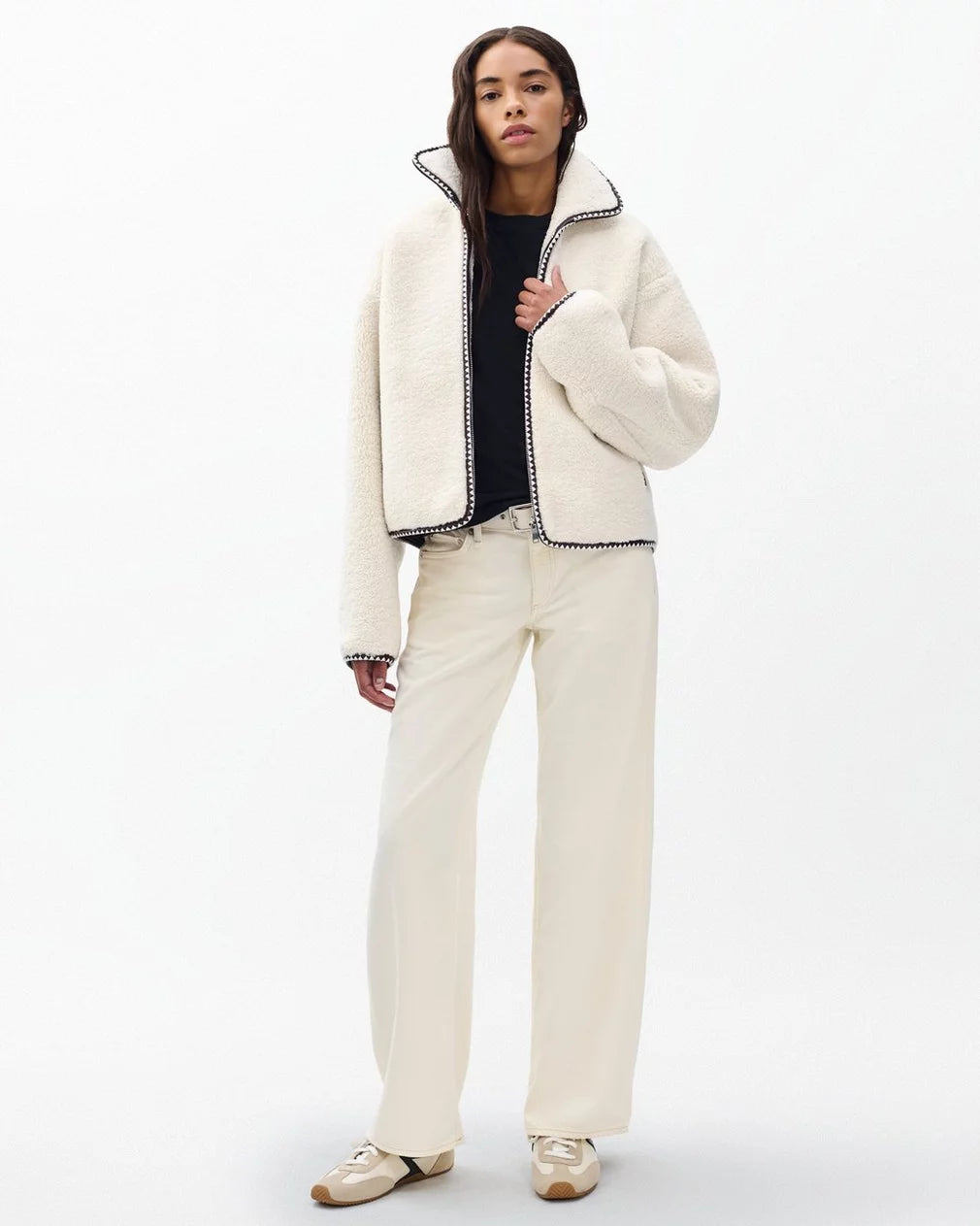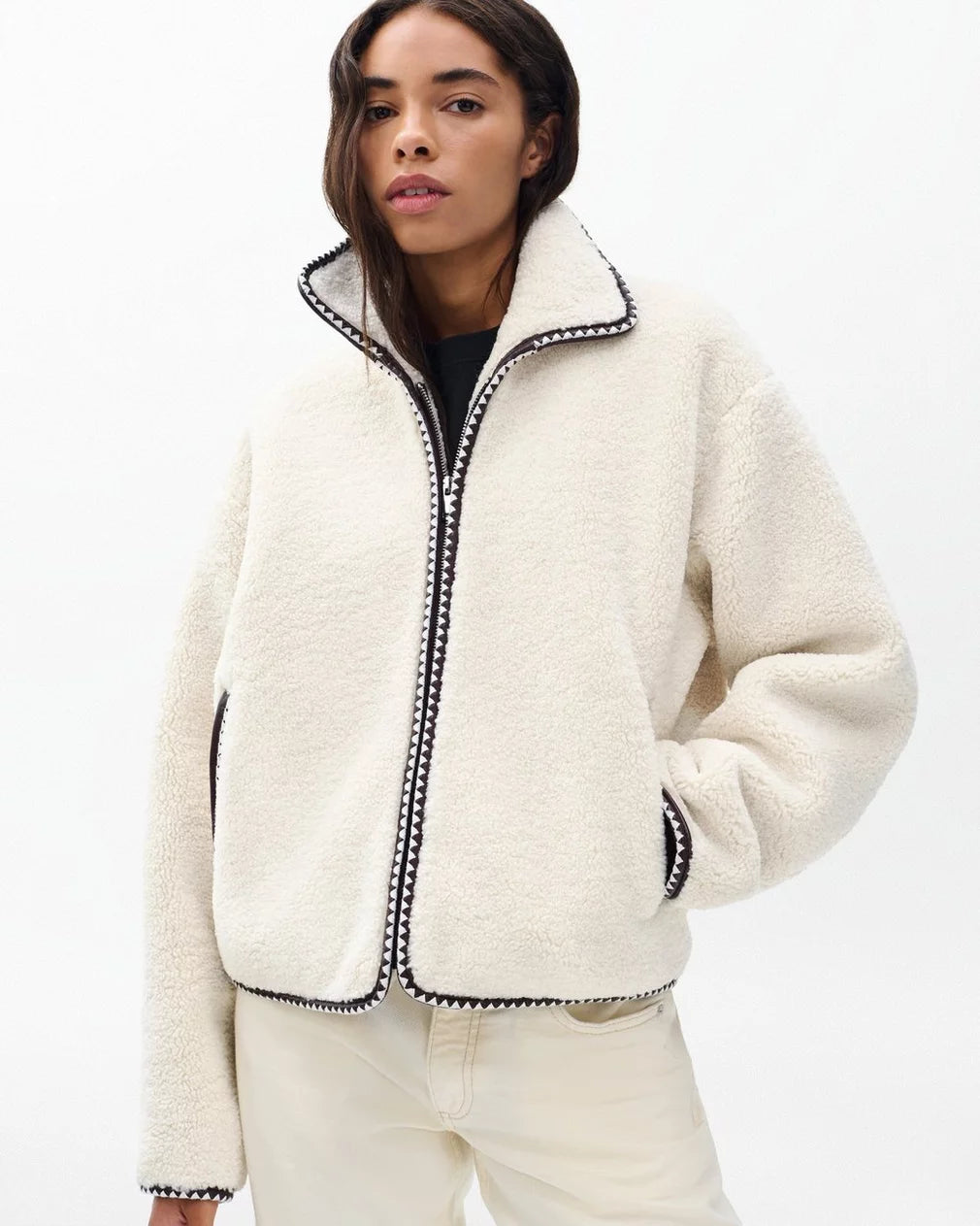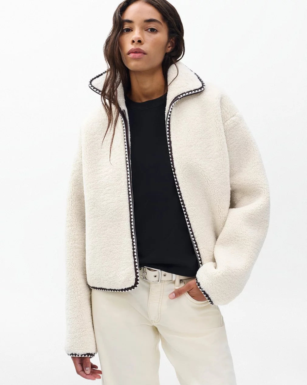 Plush comfort. Cut to fit like a bomber, this classic full-zip jacket combines lofty sherpa with contrast faux-leather binding featuring geometric whipstitching. Epitomizing cozy-chic for cooler days, it's a layer you'll want to throw on over denim or dresses.