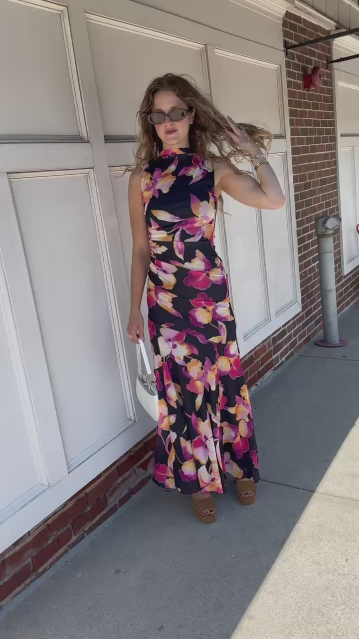 The Cosmo is a high-neck maxi dress with a full, flowing skirt and ruched sides. Fully lined and fully flattering.