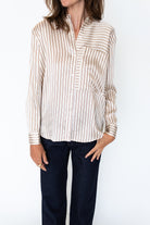 Refine your style effortlessly with this sleek button-down crafted from luxe silk charmeuse. The Spencer features vertical stripes and an oversized patch pocket, with a longer length for a flattering, relaxed fit. From work to the weekend, the Spencer is a wardrobe essential.