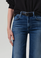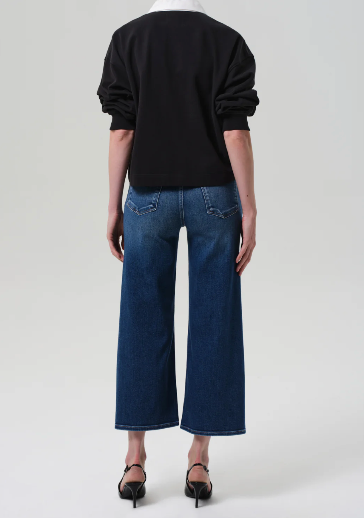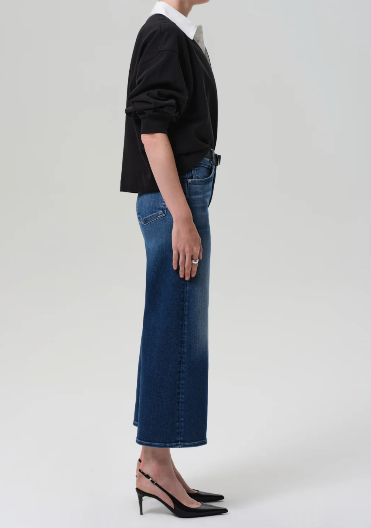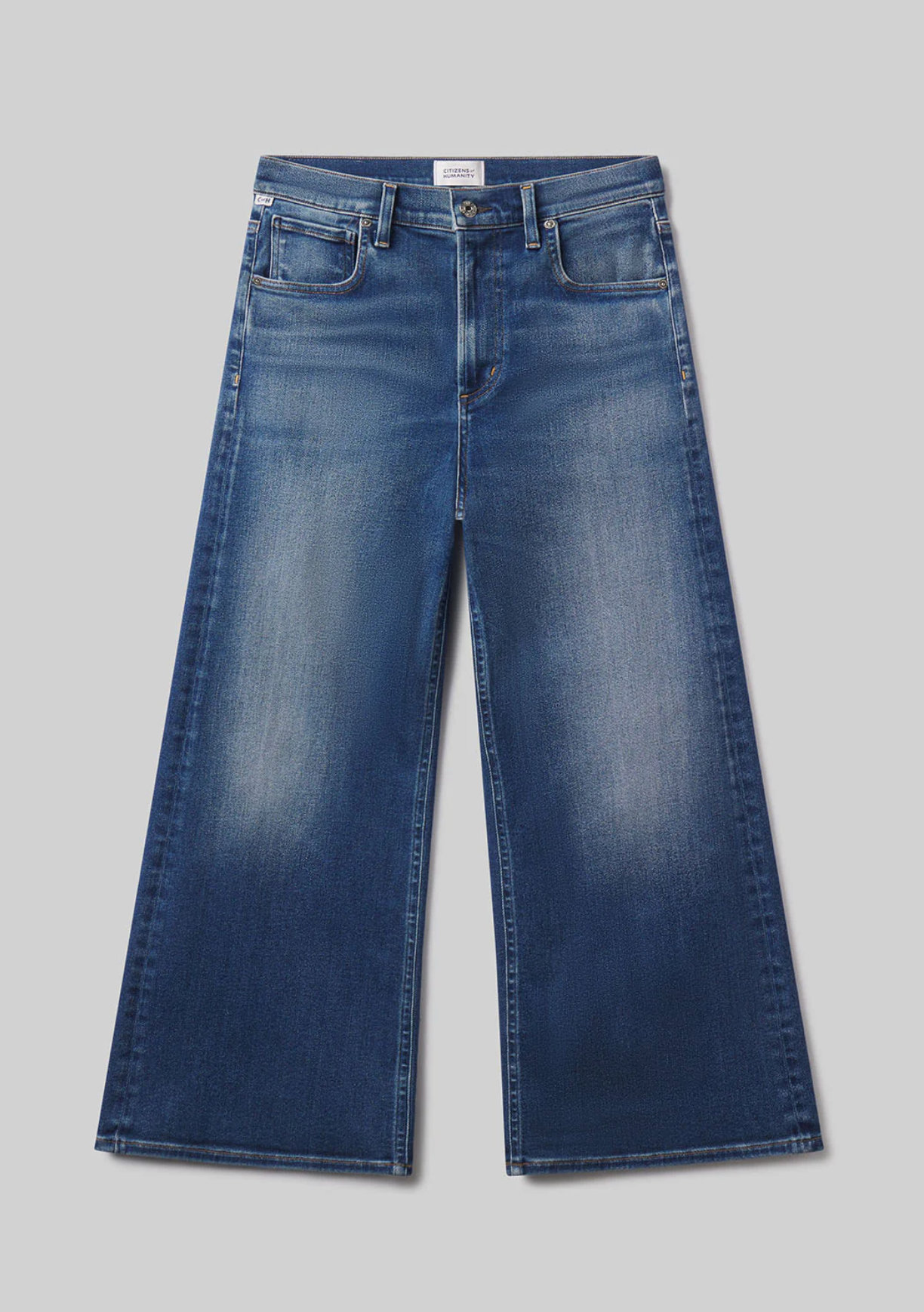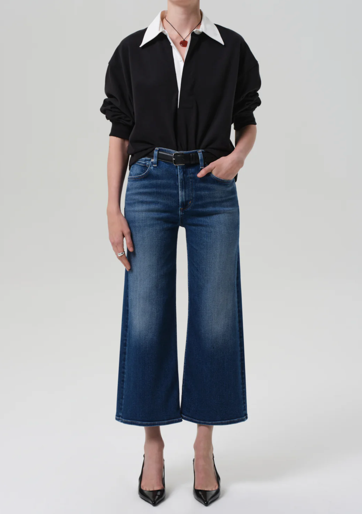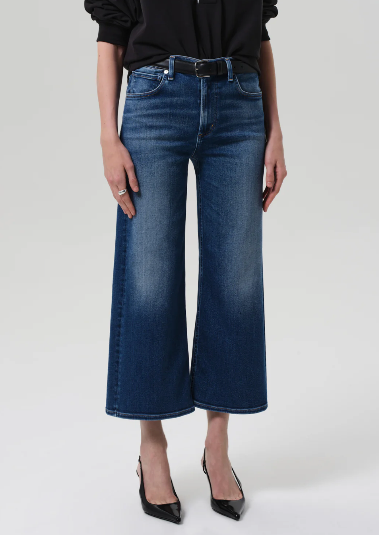 The Lyra is a vintage-inspired wide leg designed with a high rise, relaxed top block, and cropped 27" inseam. Crafted from soft stretch denim with a lightweight feel, Augusta is a medium indigo wash with subtle fading and whiskering. The clean hem offers a polished finish—easy to style with everything from boots to sandals.