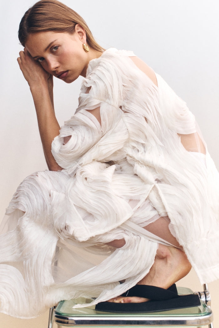 The Delmare Top in Ivory drapes with effortless ease, oversized yet poised. Wide sleeves and a gentle round neckline frame the body without constraint, letting movement and form take the lead. Tonal threadwork adds subtle depth without ever overwhelming. Pair with the matching Delmare Skirt for a textural duet, or wear over denim or tailored trousers for an effortless, magnetic presence.