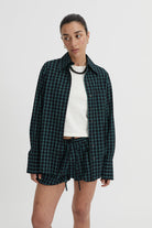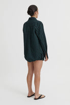 Checked but not precious, the Isley Shirt in Black leans into contrast. The oversized cut falls long through the body, balanced by a sharp collar and single chest pocket. Worn open or done up, she shifts with your mood — bold one minute, barely there the next. The soft cotton feels lived in from the first wear, with the kind of texture that looks better the more undone it gets.