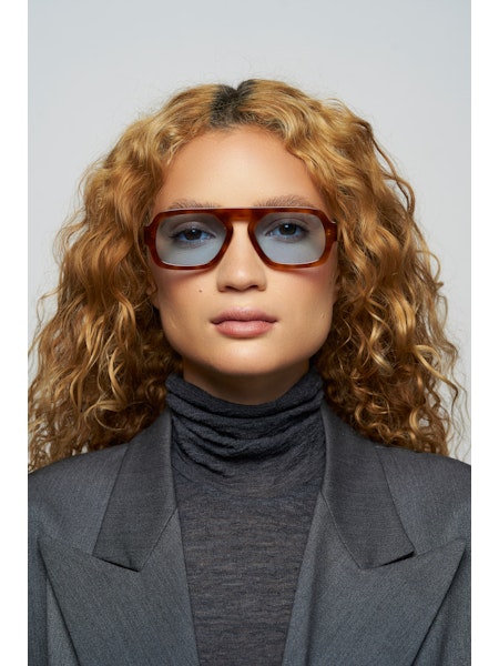 Jane, named after birthday twin Jane Fonda, is commanding, luxe, with an edge—always. These aviator sunglasses embody timeless sophistication with a modern twist and bold blue lenses.
