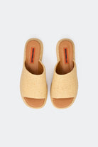 RAFFIA PLATFORM SLIDE SANDAL WITH VEGAN LEATHER FOOTBED.