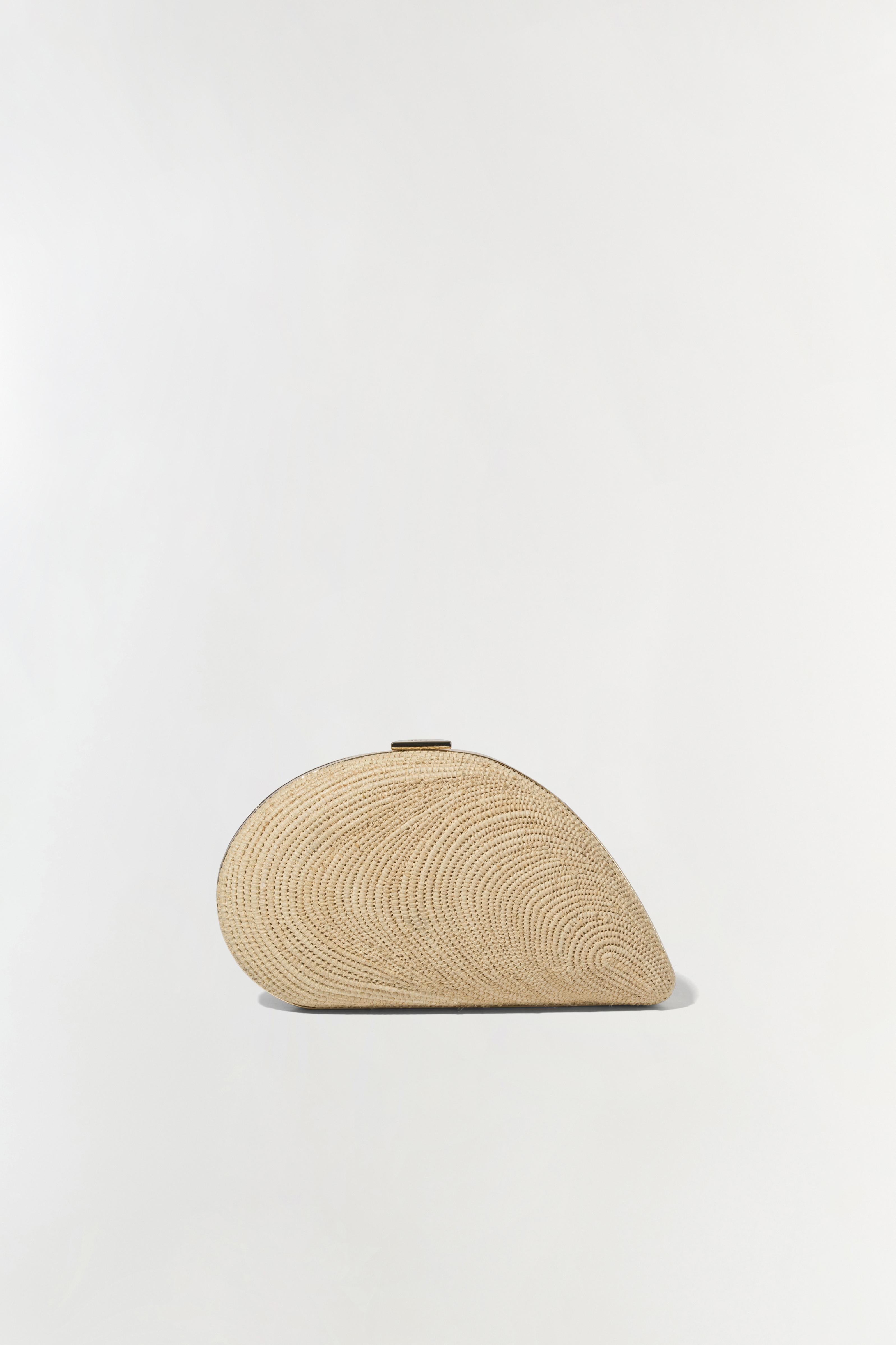 A snap-top clutch in an inspired shell shape with a textured raffia exterior and chunky detachable chain strap.