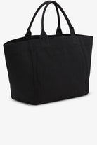 This tote bag is crafted from black canvas and features a banana print with a GANNI logo and a 'Have a nice day! Please recycle' message. The bag has top handles and one compartment.