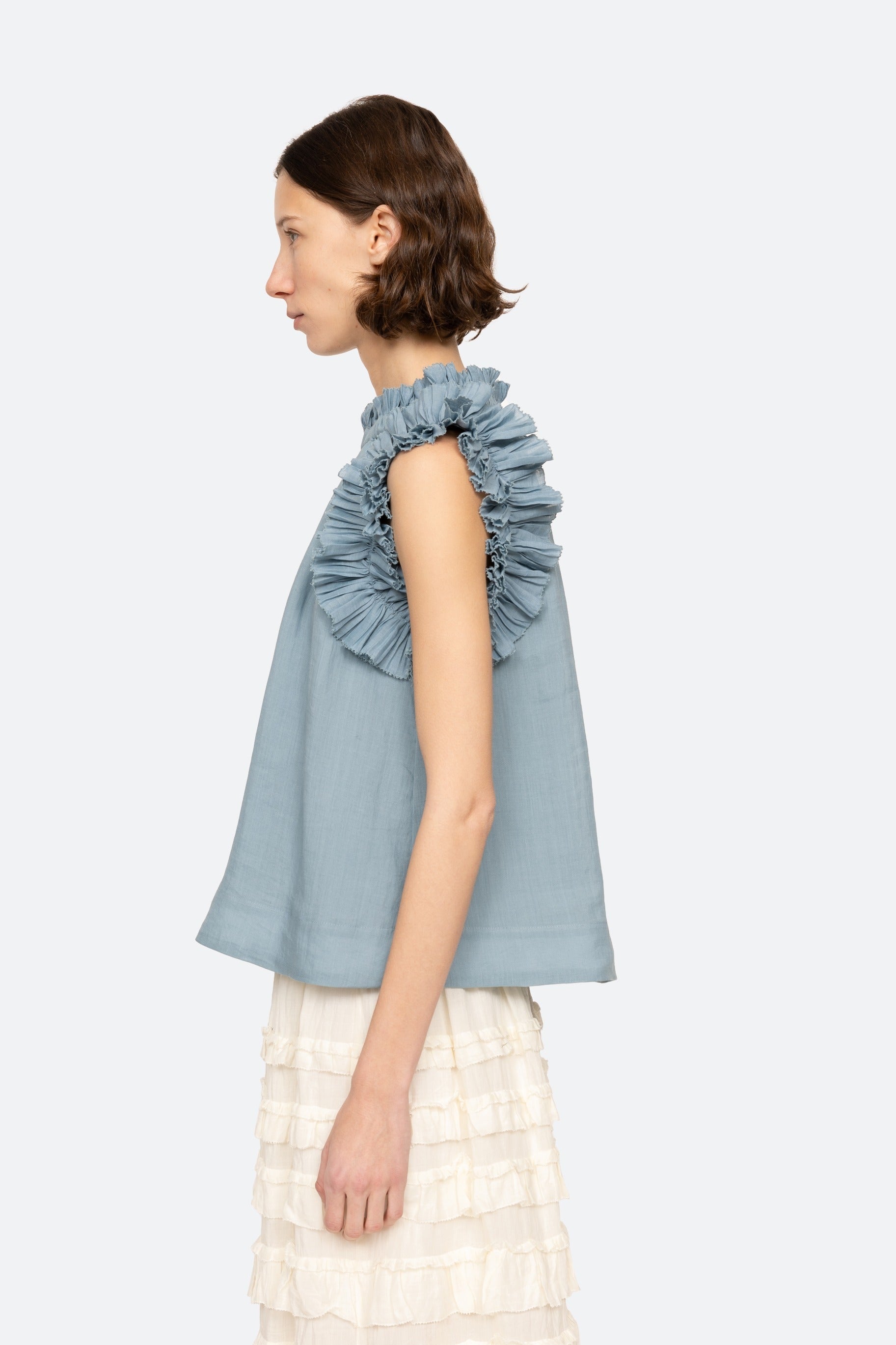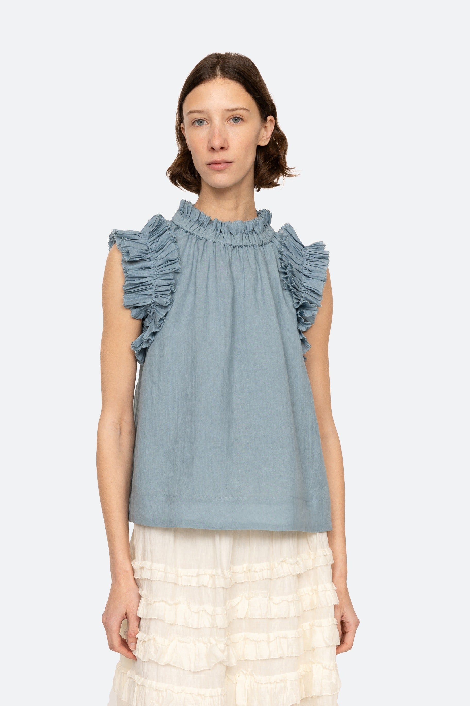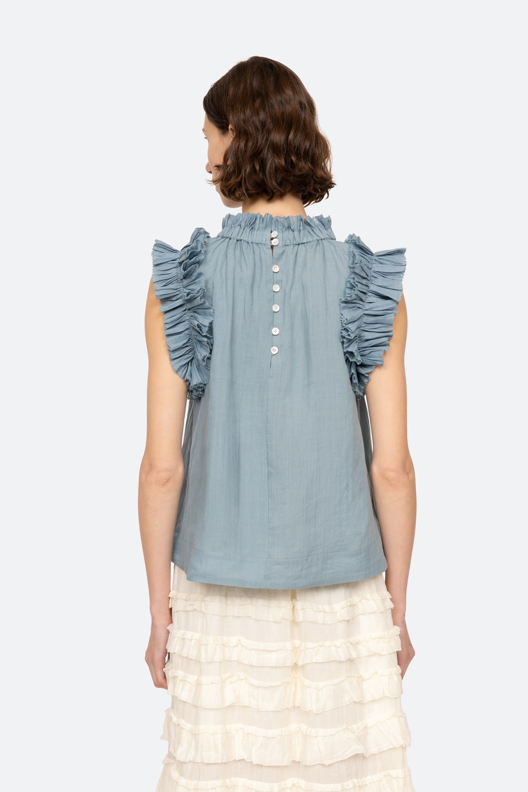 The Anise top is a stand alone top with soft ruffles around the neckline and sleeves.