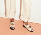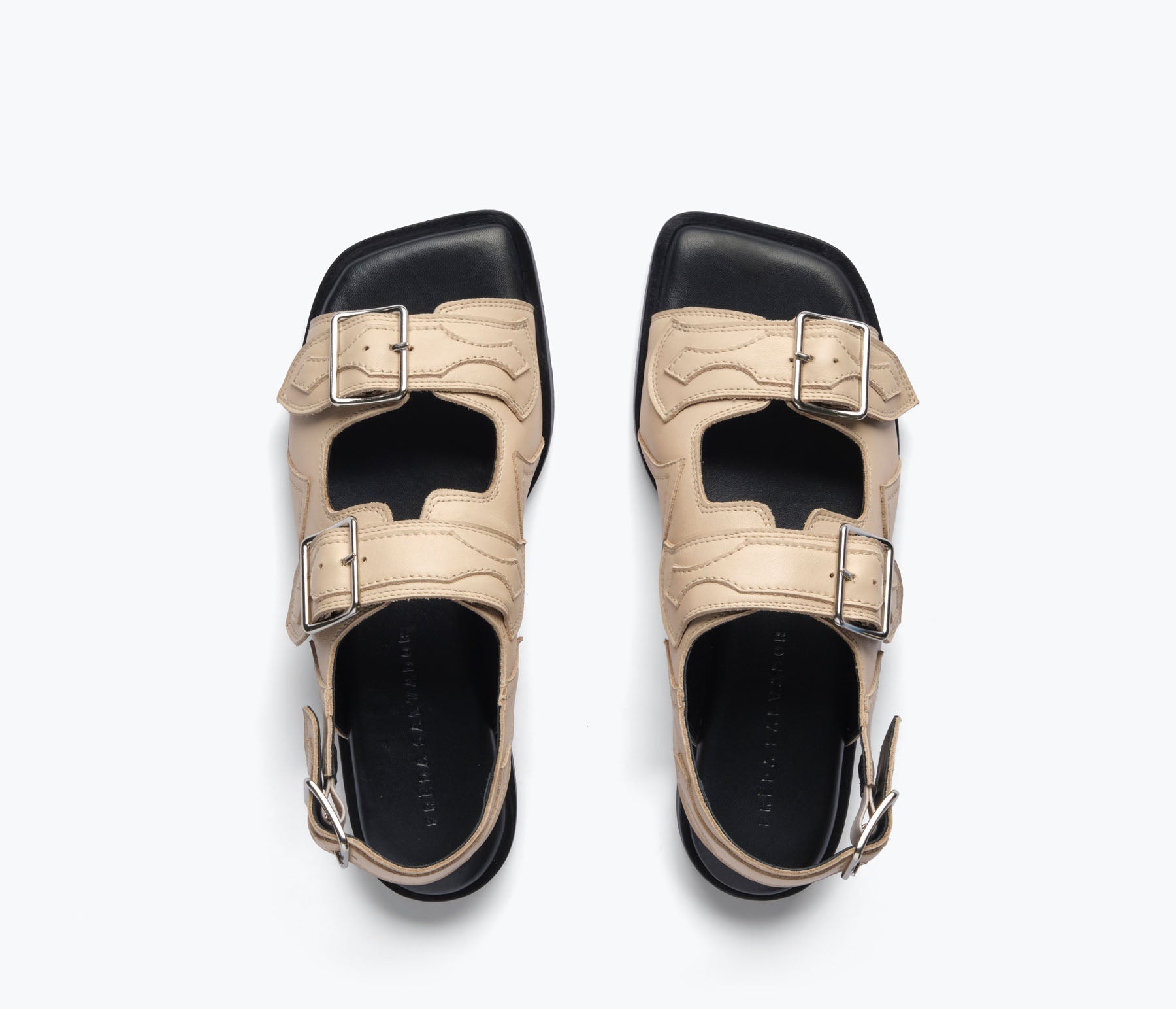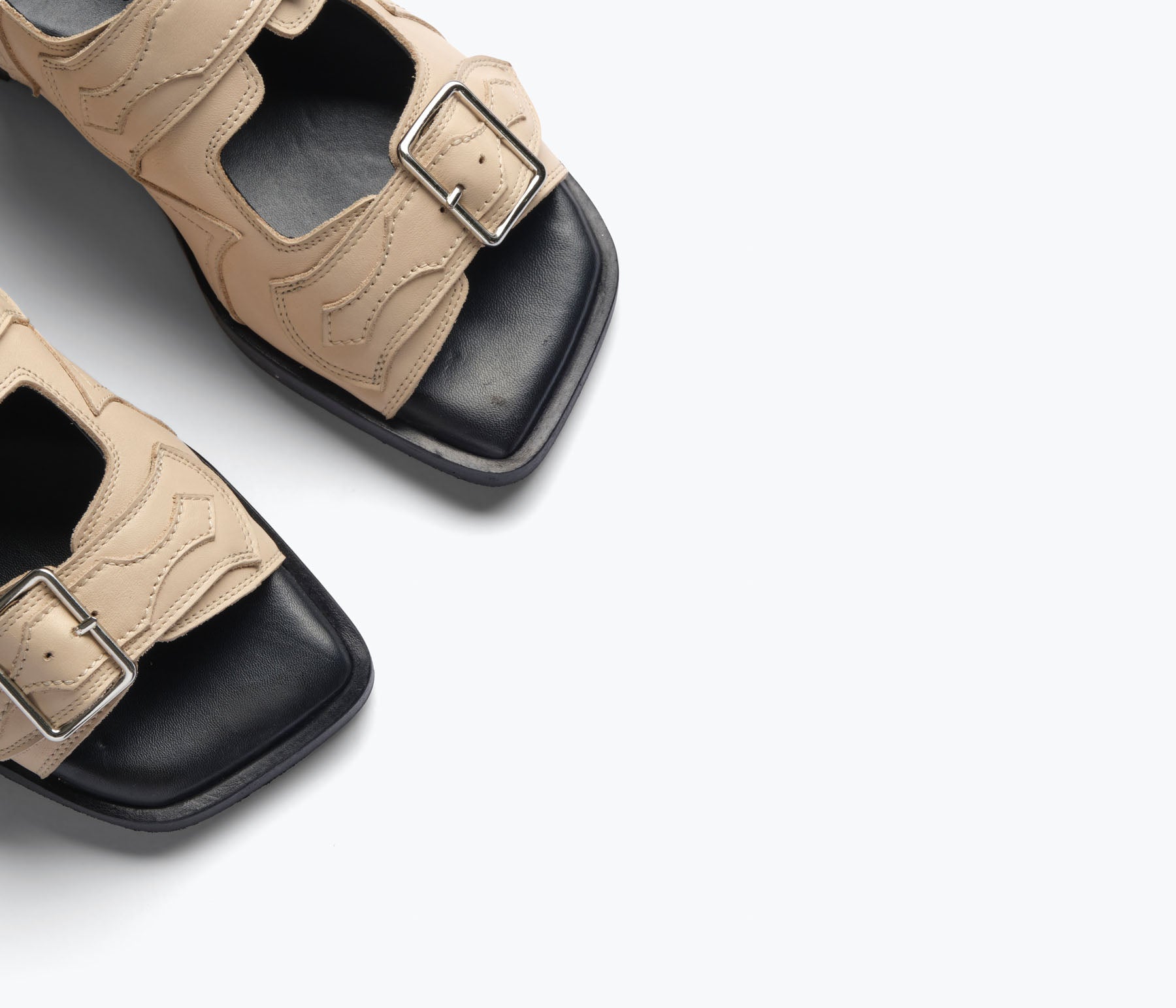 The western-inspired sandal. Made by hand with sand calf leather, the FAYE takes notes from a Western style with traditional overlay pattern pieces but is an everyday buckle-strap sandal with a modern square toe. The contrast sole elevates every vibe from denim to dresses.