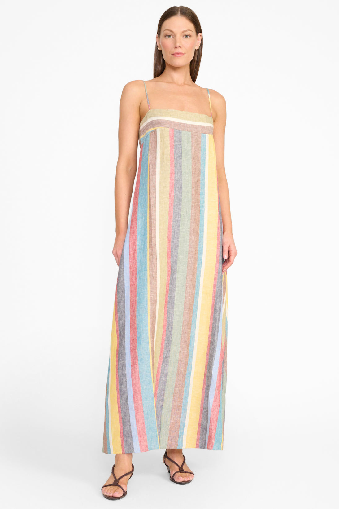 The Laura Linen Dress is a best-selling maxi dress silhouette perfect for Spring. This style features a straight neckline, spaghetti straps, and a playful seasonal print.