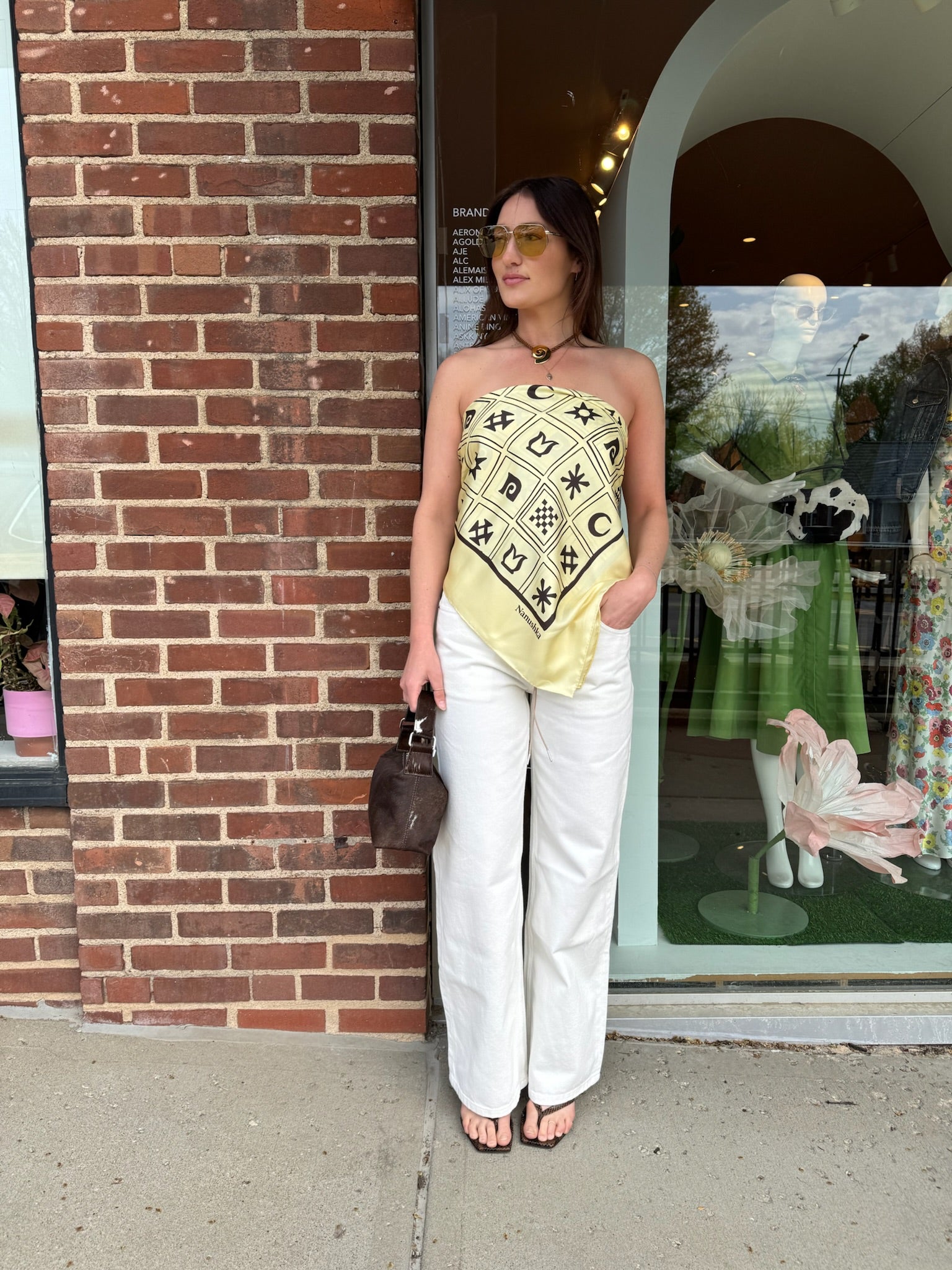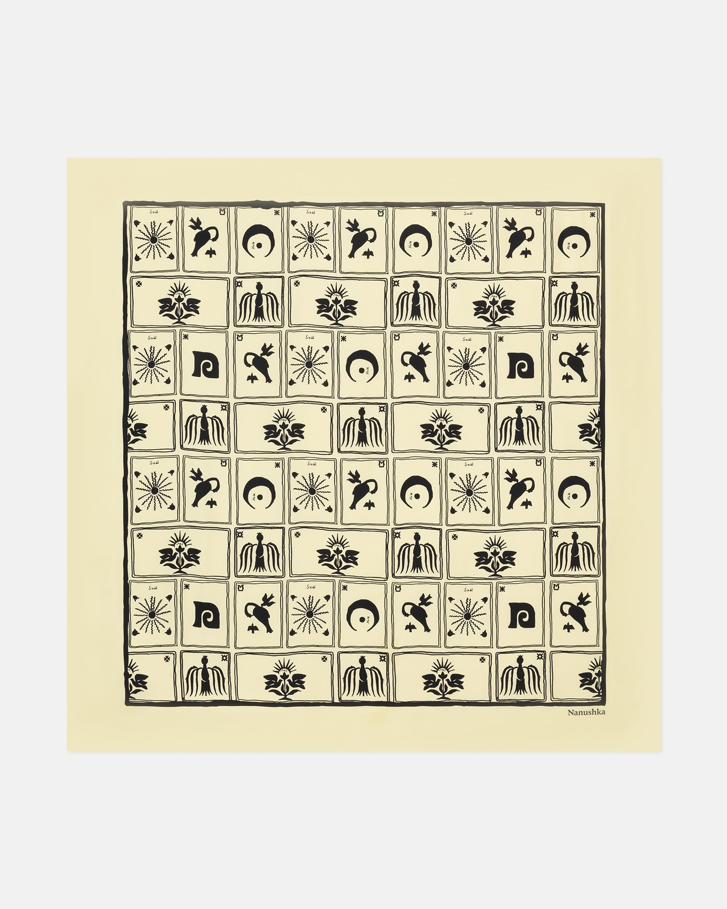 The Miani scarf is decorated with our Folk Art print – an array of motifs inspired by folklore. Made from silk, it can be styled endlessly, from around the neck and shoulders to looped round the handle of a tote.