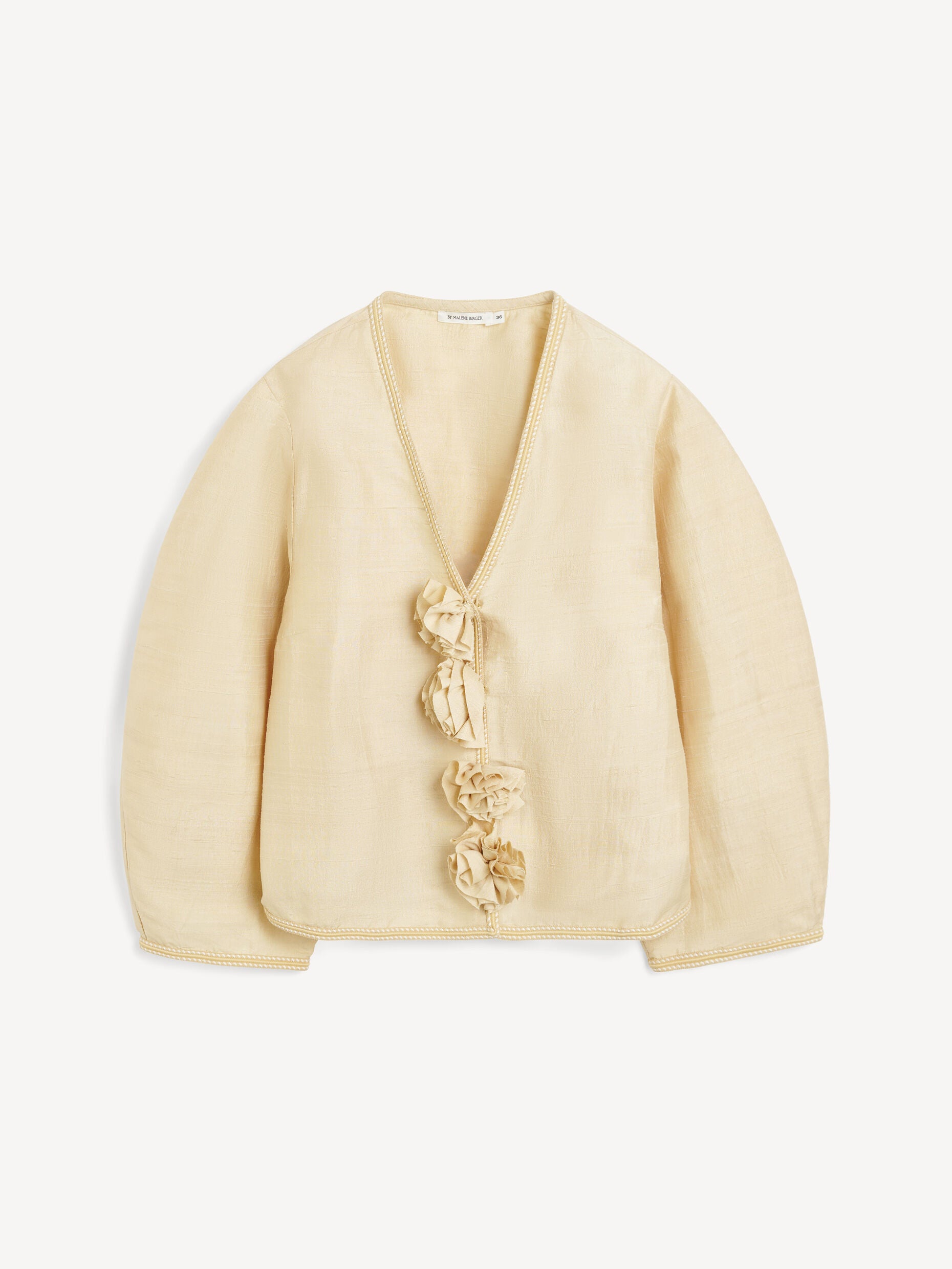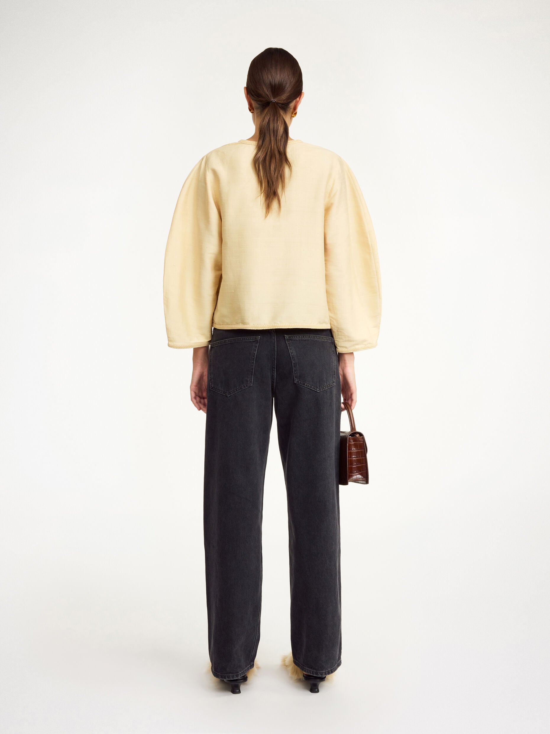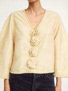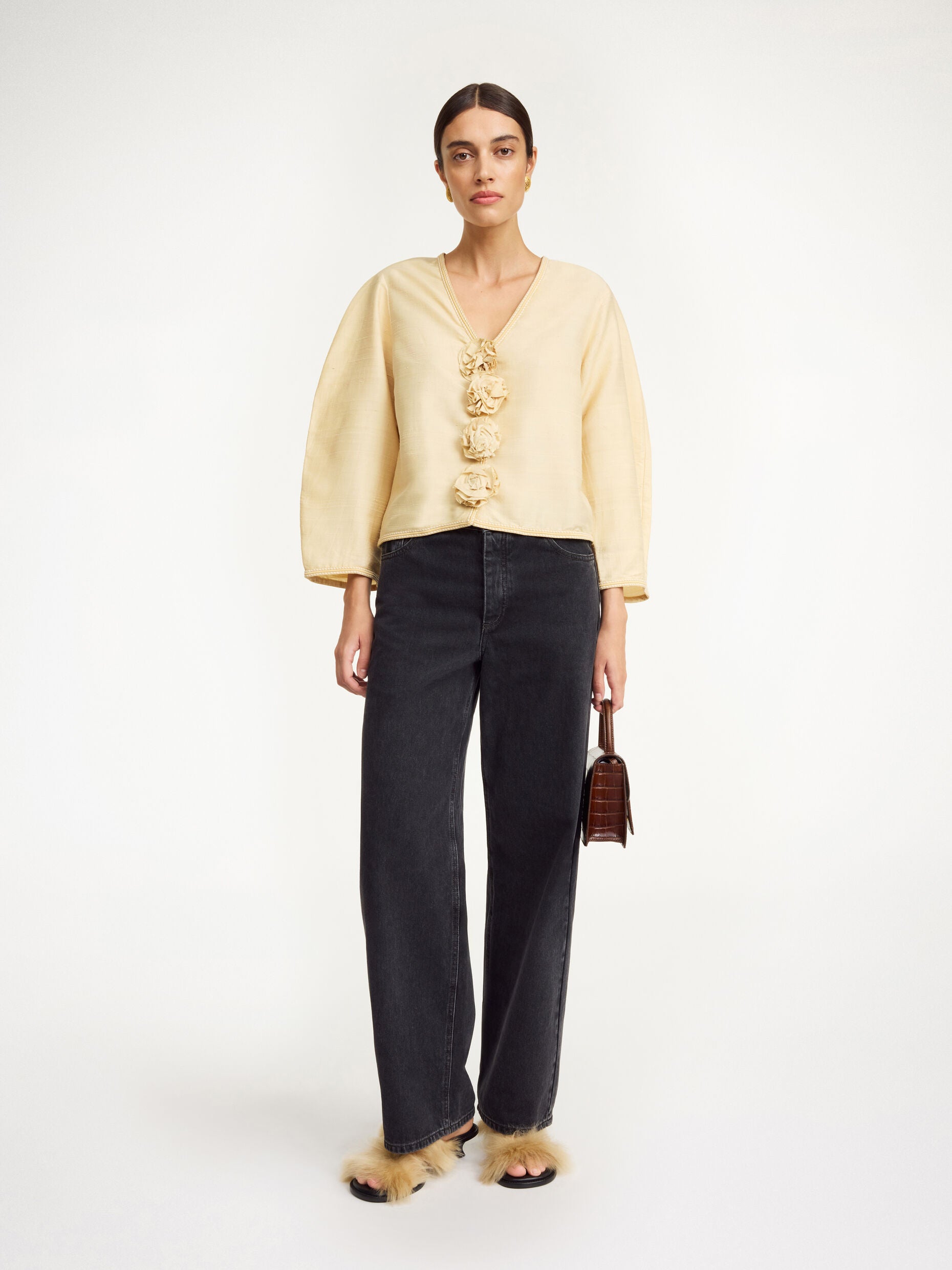 With its delicate Thai silk and billowing silhouette, the Mineas top channels a bohemian vibe. It has a V-neck and wide sleeves tapered towards the cuffs.