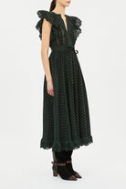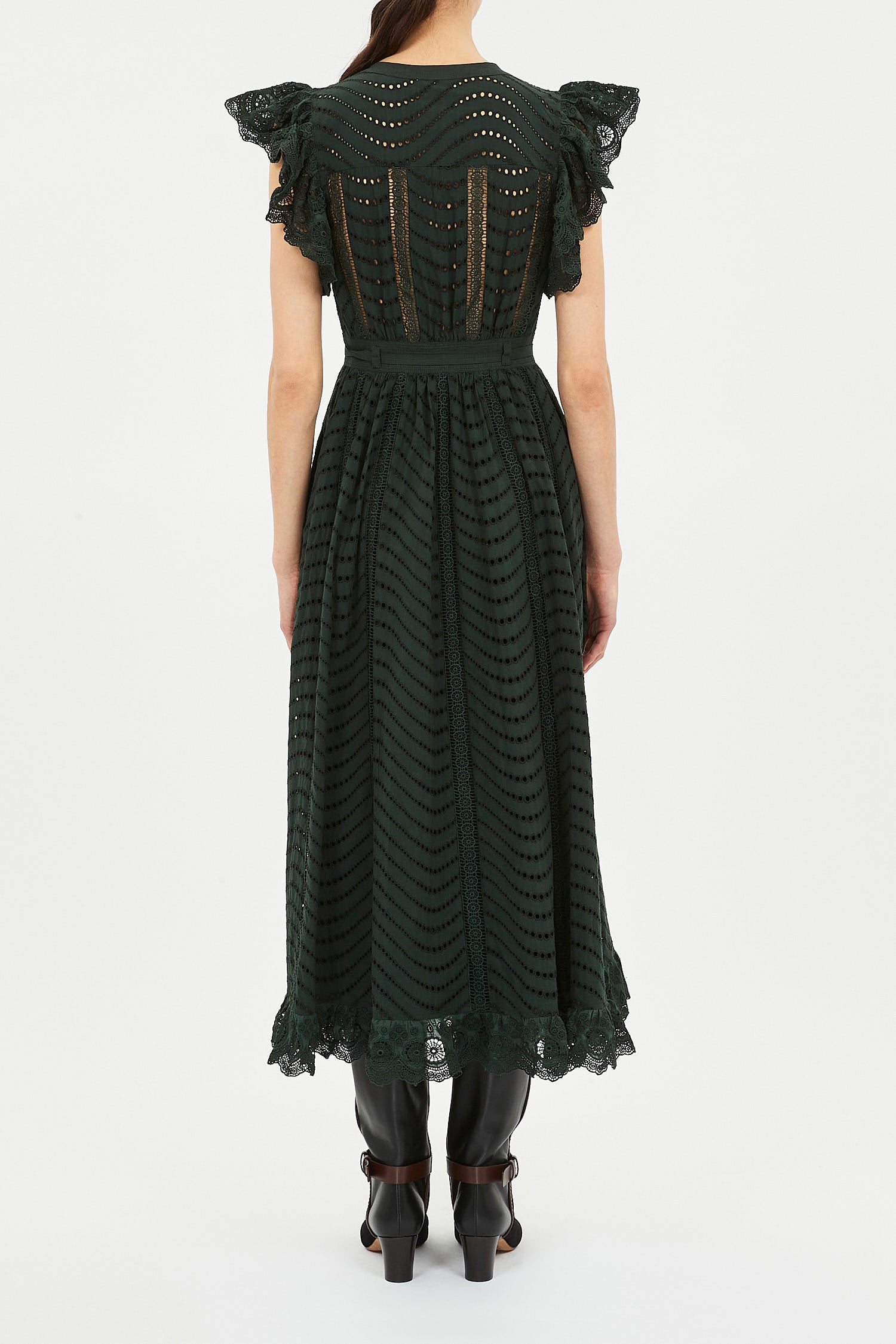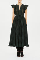 The Olga Dress catches the eye with degradé eyelets that undulate across signature water-washed poplin. Tinged a deep green, it is adorned with lace inserts that subtly reveal and ruffled scalloping for added dimension.