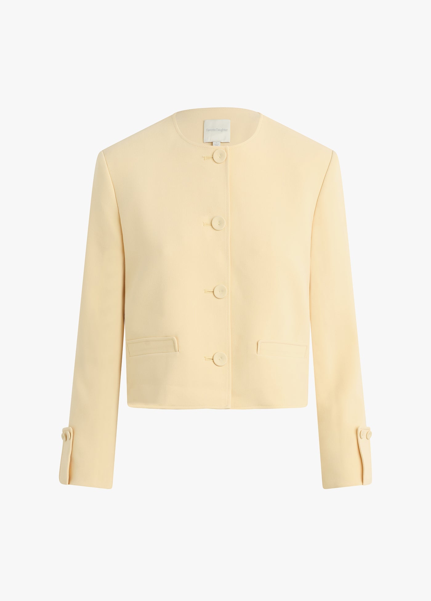 Say hello to your new sunny-day staple. The Aurora Jacket is cropped, slightly boxy, and effortlessly chic in a soft, structured blend with just the right amount of stretch. Finished with a collarless crew neckline, button front, and cuffed sleeves.