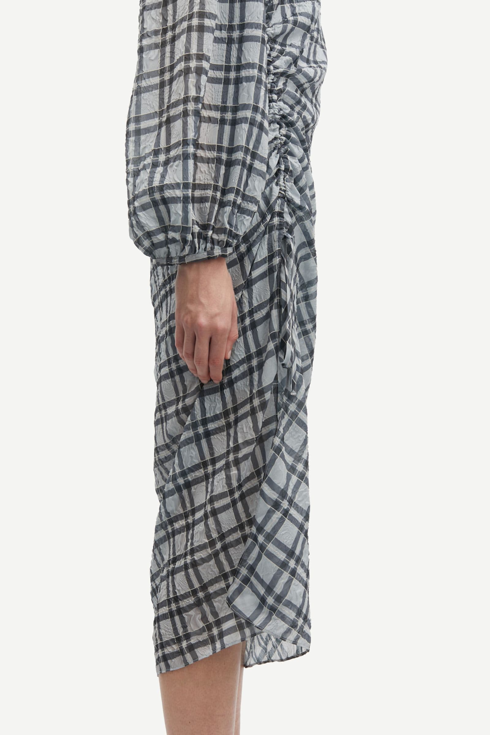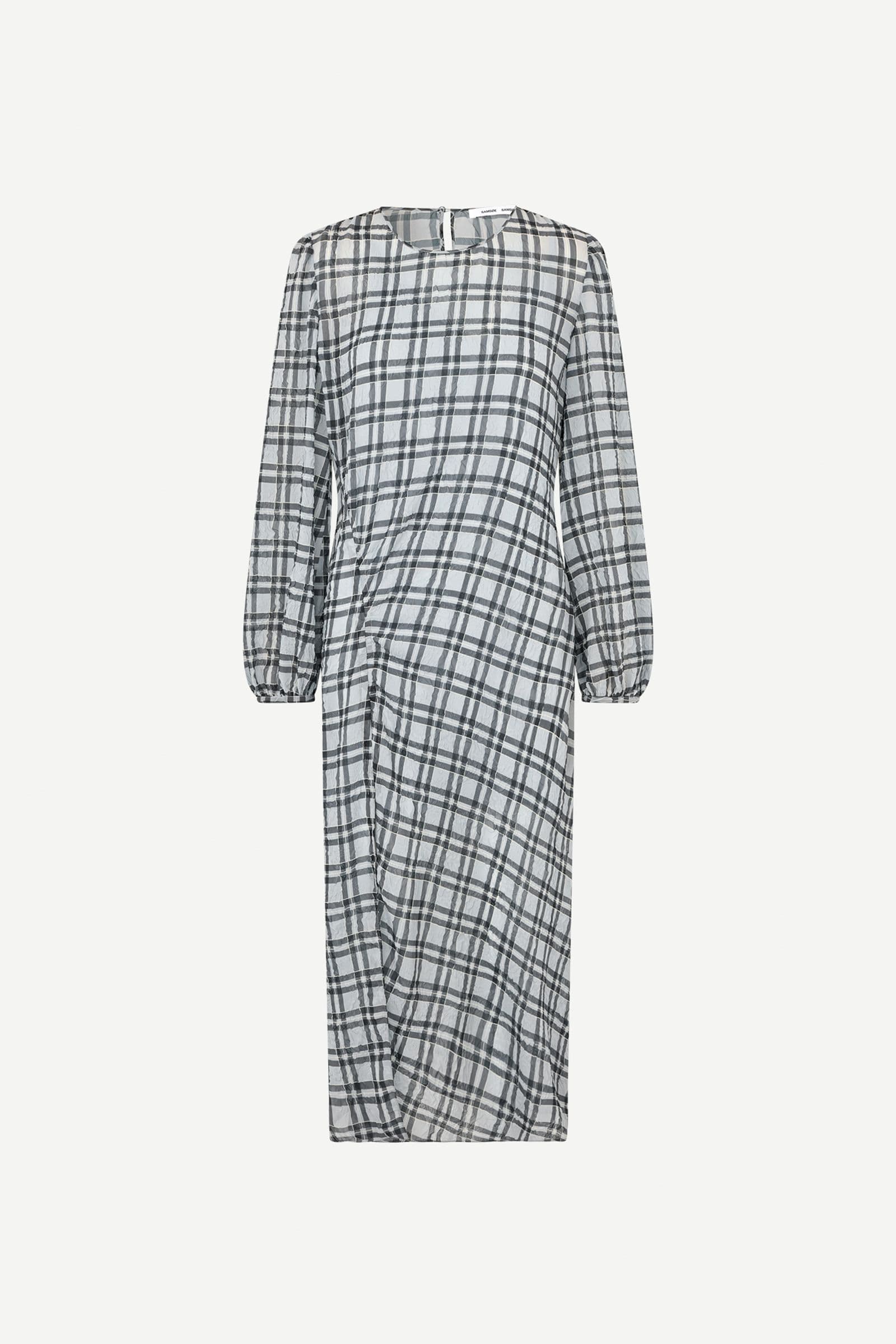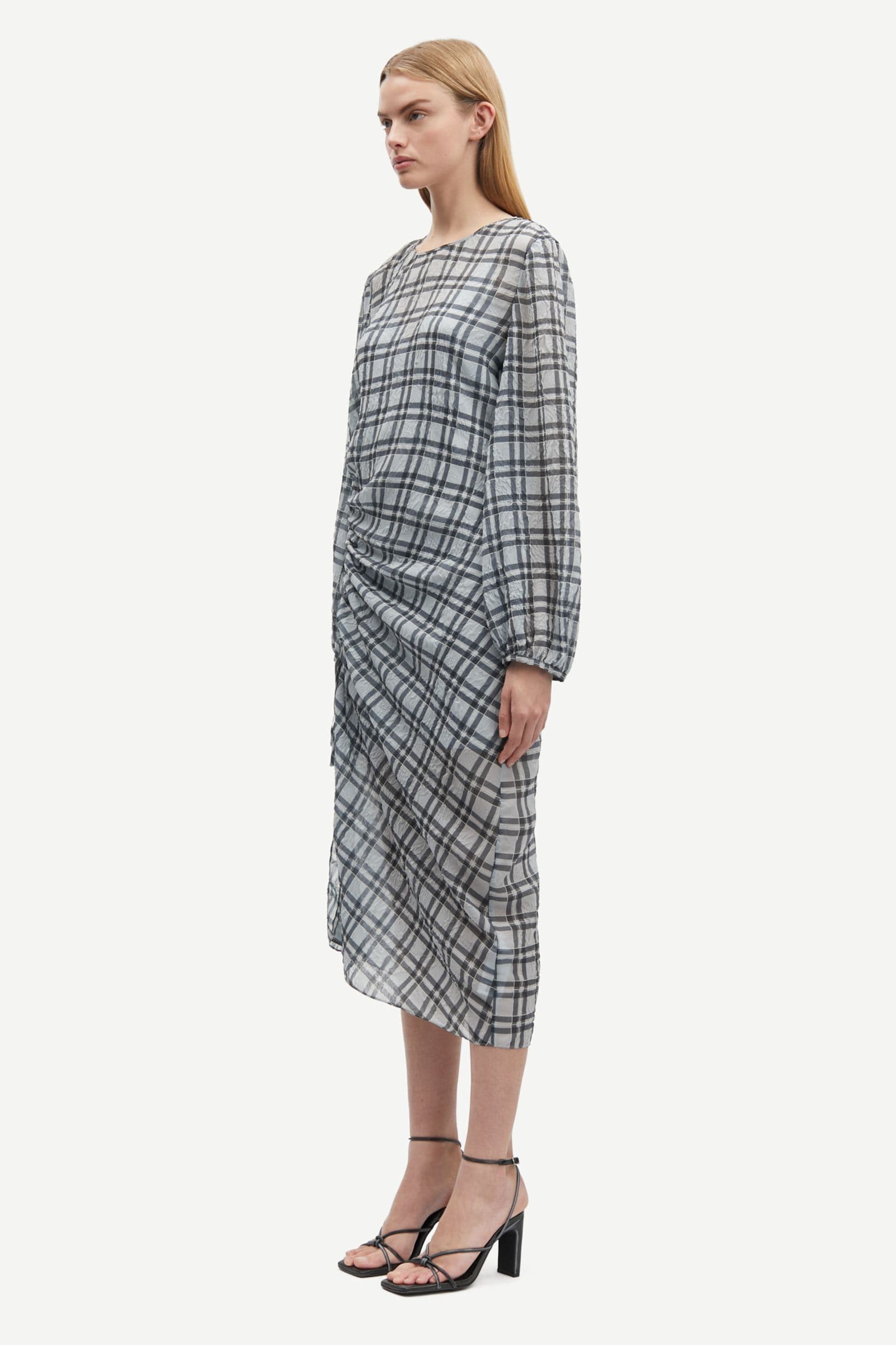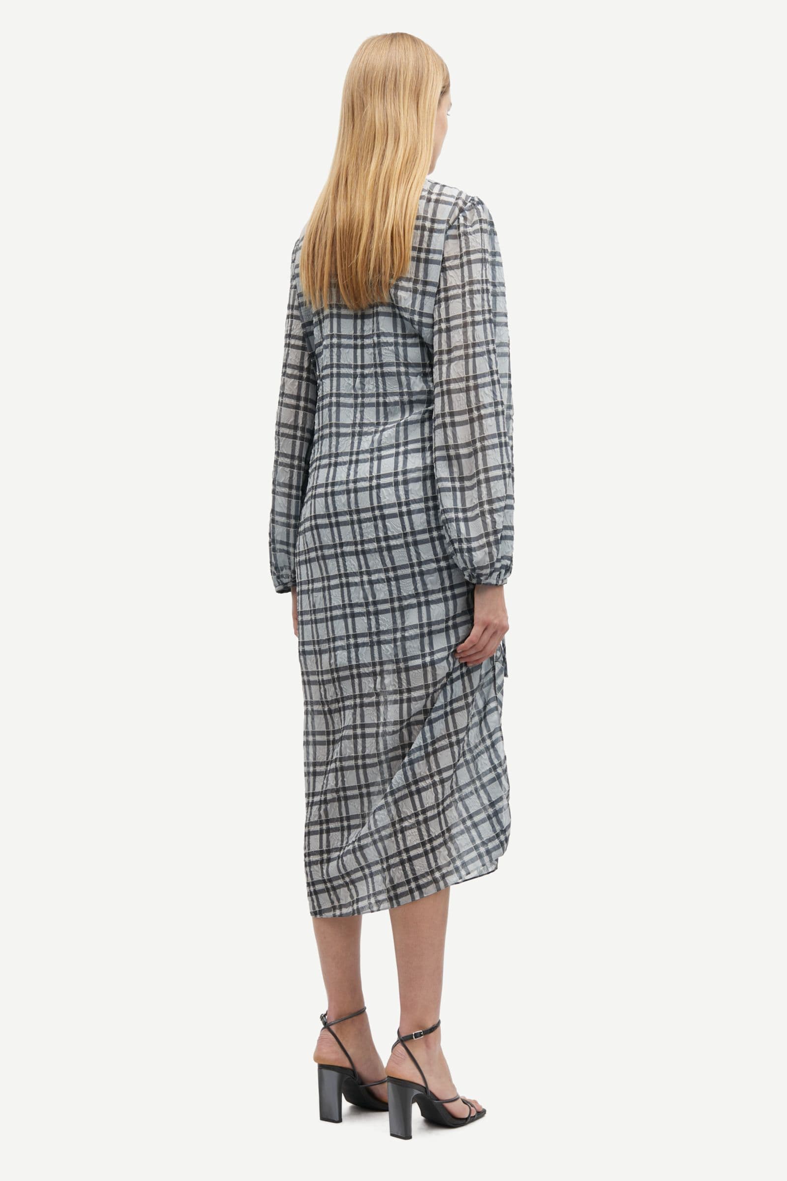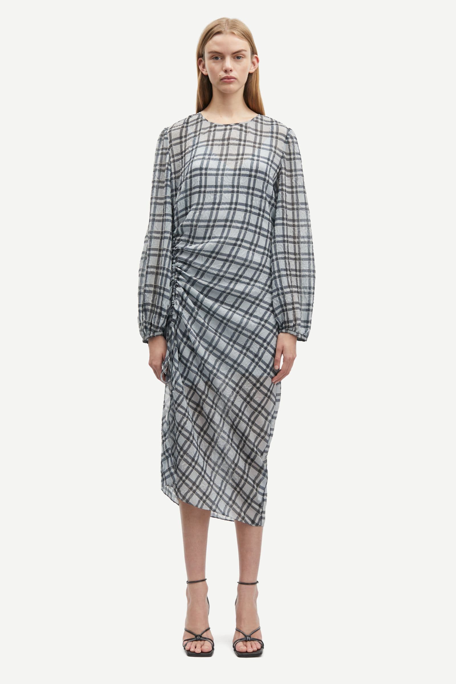 Long-sleeved mesh midi dress with a regular fit and slip dress. Button and loop closure at the back. Adjustable straps on the slip dress. Gathered detailing on the side. Slit at the leg. Checked pattern and semi-sheer fabric. Main material of dress and slip dress made from 100% recycled polyester.