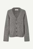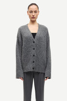 Knitted cardigan with a loose fit and dropped shoulders. Button closure on the front. Rib-knitted cuffs and hem. V-neck. Brushed look. Main material made from an elastic blend including alpaca wool.