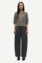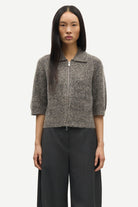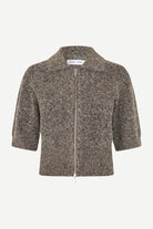 Short-sleeved cardigan with a regular fit and dropped shoulders. Two-way zipper closure on the front. Rib-knitted collar, cuffs, and hem. Main material made from an elastic wool-blend.
