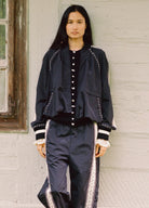 The Alberta windbreaker jacket is thoughtfully detailed with hand-crocheted trim and delicate pearl accents throughout. This unexpected pairing of utility and craft adds a refined, feminine touch to the lightweight silhouette.