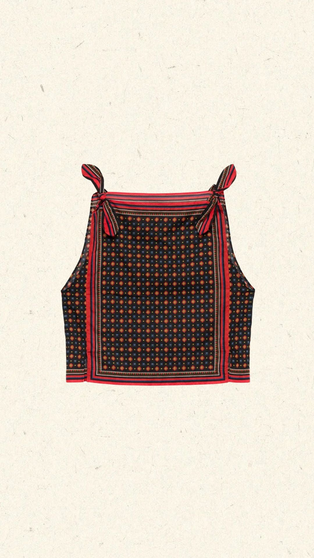 The Amalia Top is crafted from a midweight organic cotton voile, featuring a sleeveless silhouette, bateau neckline, and adjustable shoulder ties. Rendered in our Montmartre Foulard print, it’s finished with placed stripe borders along the neckline, hems, and shoulder ties