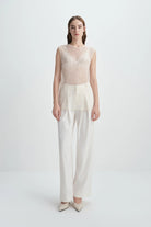 Pleated mesh top with sequins in a sheer finish, offering light volume, texture, and sparkle for elevated evening sophistication.