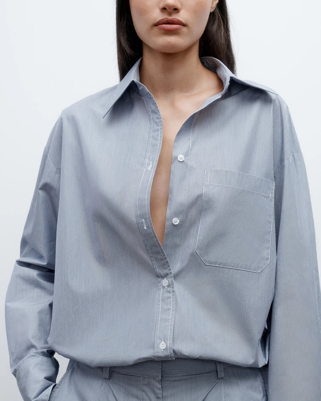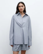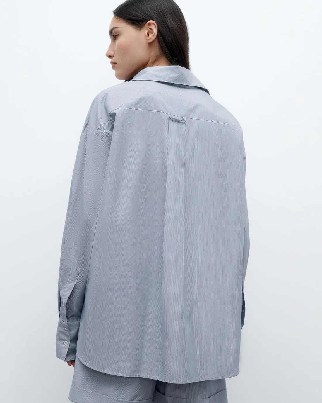 Oversized shirt in finely striped super-fine Italian cotton shirting. The Big Joe is a menswear-inspired, relaxed button down. Complete with a chest patch pocket, button up placket, french cuffs and a tulip hem.