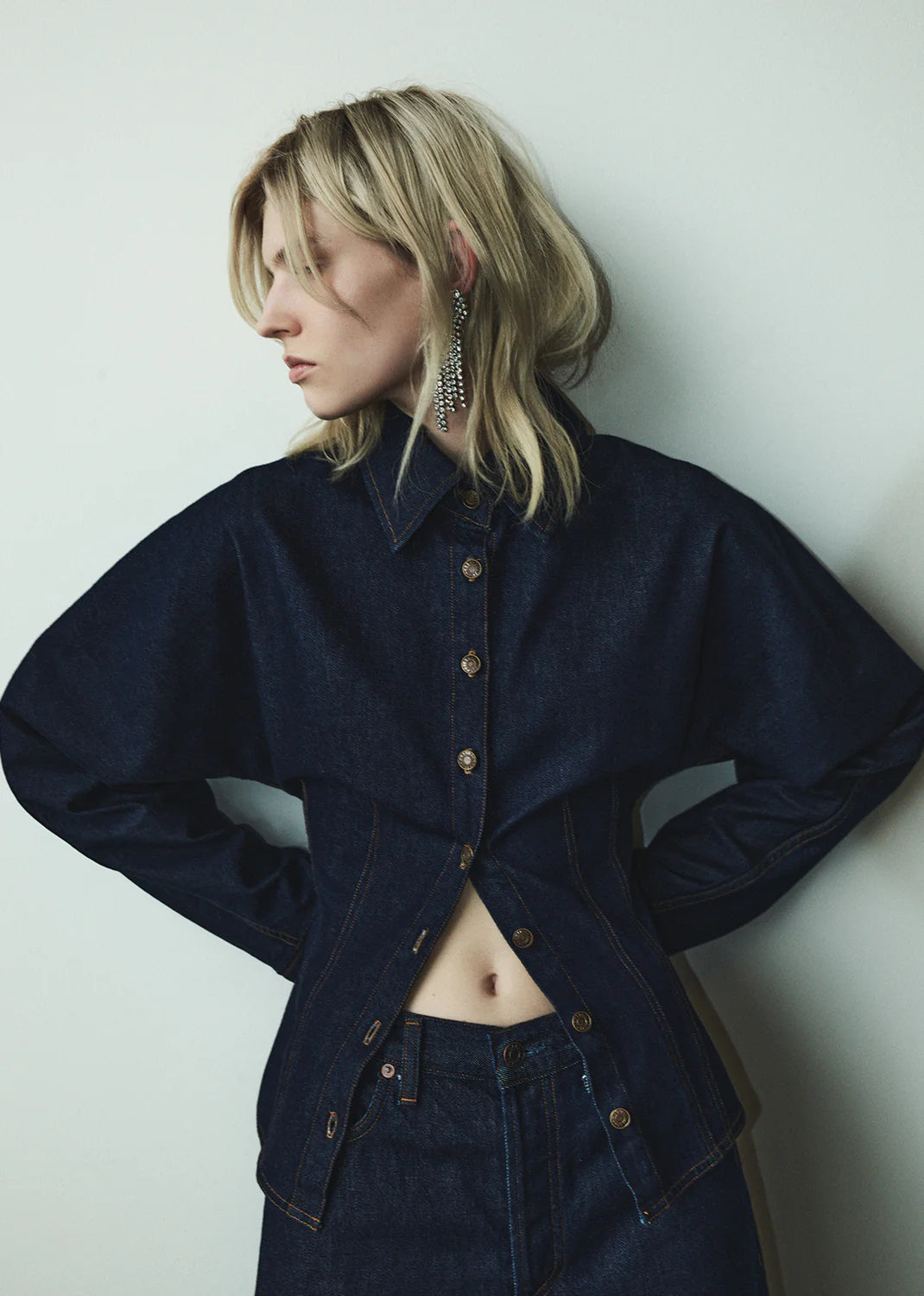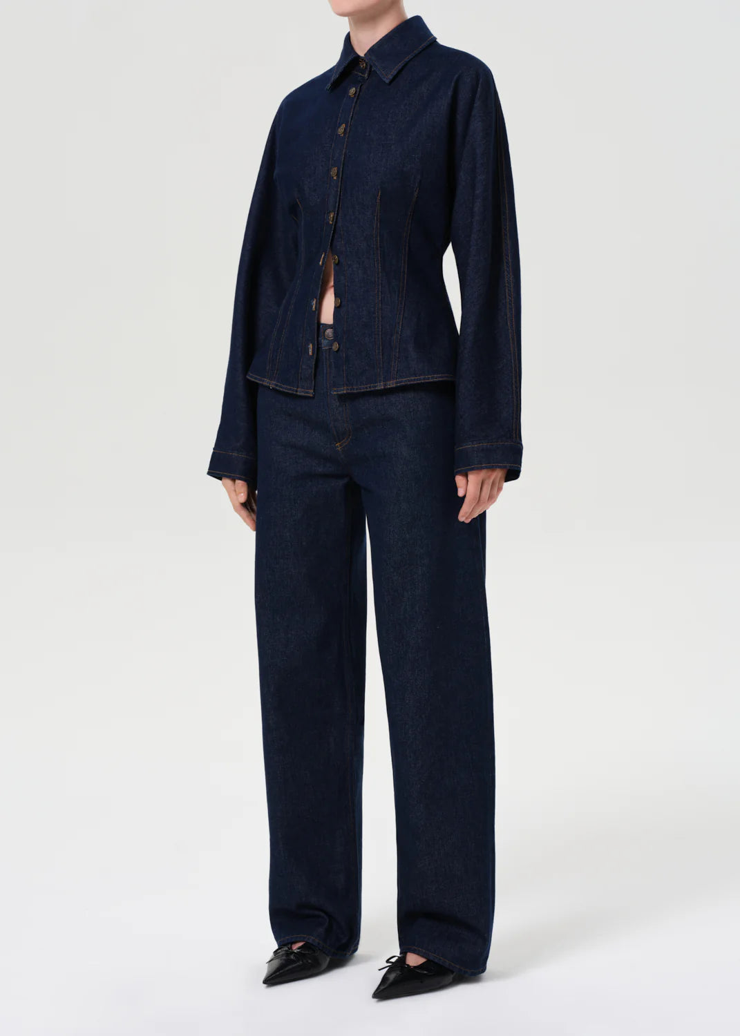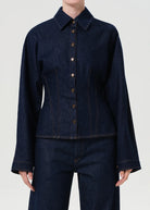 Looks Like: Dark deep rinsed indigo denim button front shirt