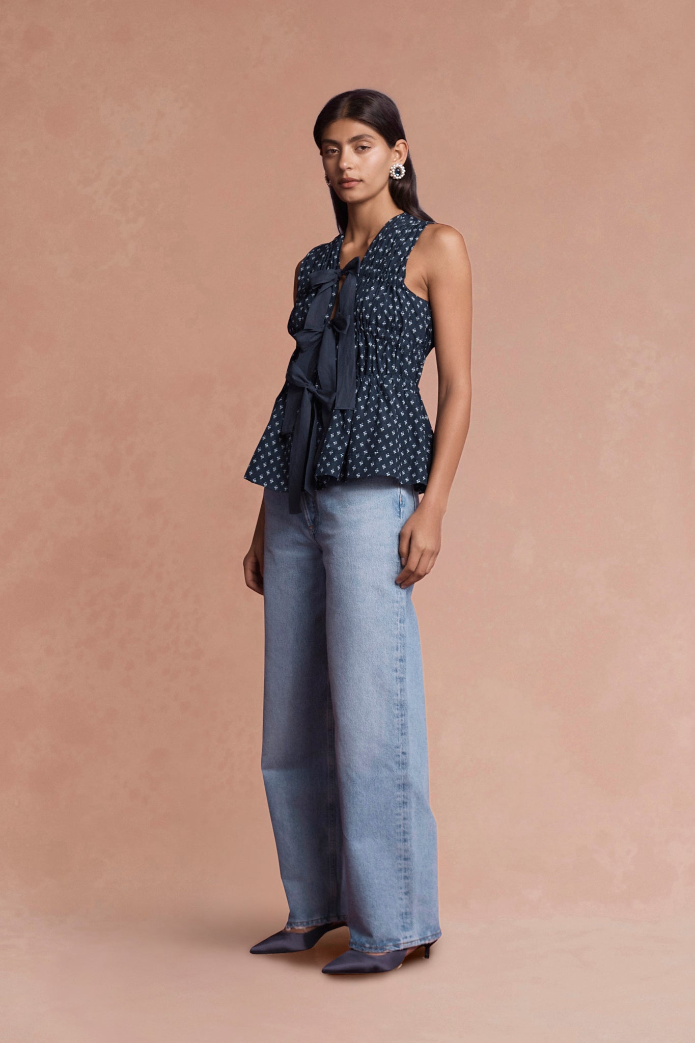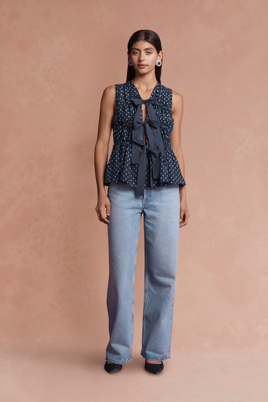 The Rosie top in navy floral is a refined blend of timeless elegance and feminine charm. Crafted from a luxurious fabric with a soft, flowing drape, this top features the classic Lovaan bows in ribbon at the centre front that create subtle ruching through the body that adds a flattering texture to its silhouette. The vibrant floral print adds a touch of sophistication, perfect to be dressed up or down with ease.