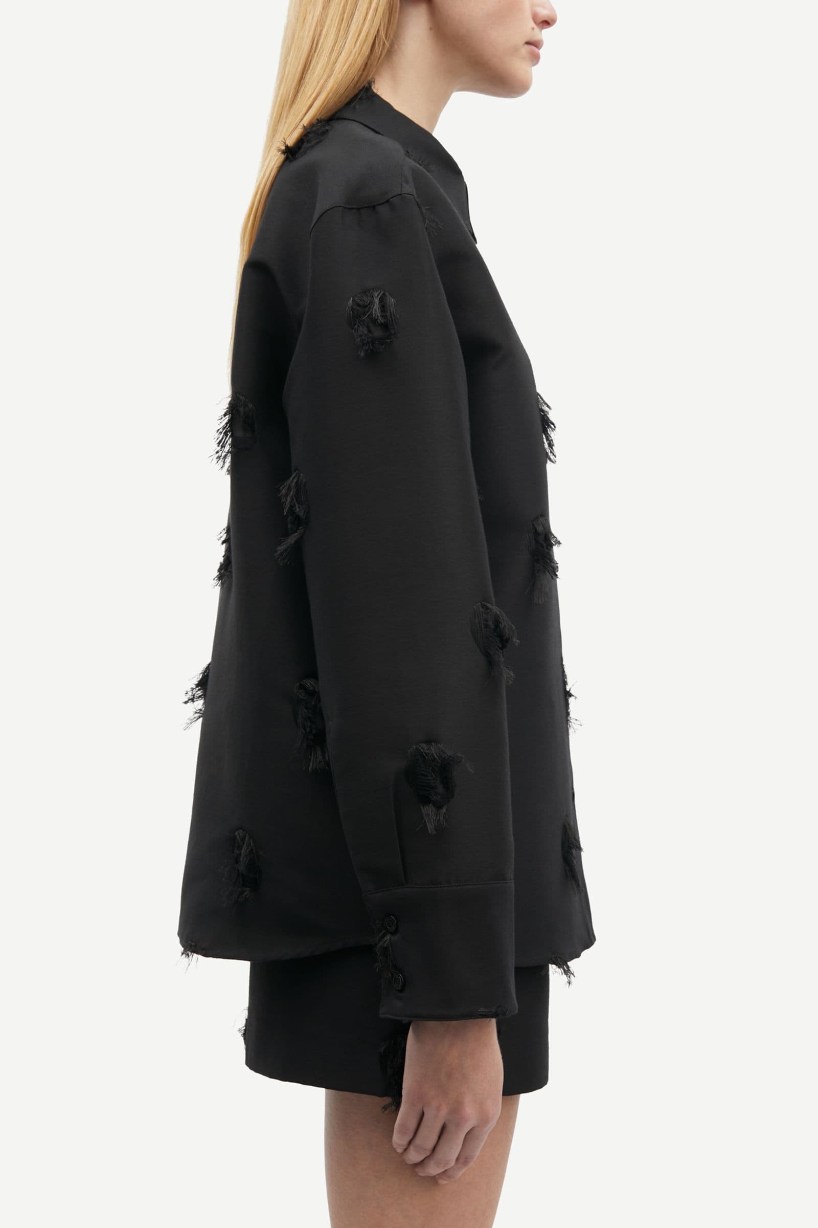 Long-sleeved shirt with a loose fit and dropped shoulders. Button closure on the front and buttoned cuffs. Fringed details. Main material made from a blend of recycled polyester and cotton.