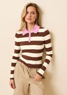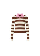 The Debra Top features a bold rugby stripe for a sporty, elevated look. This long sleeve, polo-style silhouette is designed with a contrast collar, button placket, and self-covered buttons.
