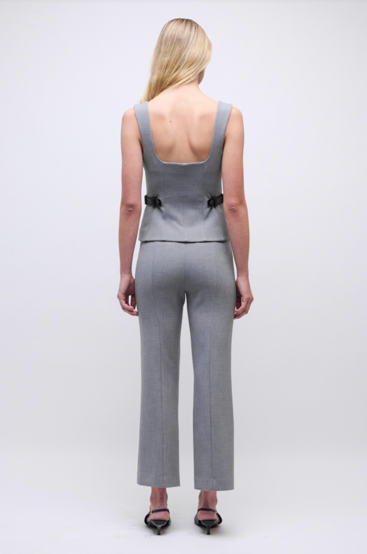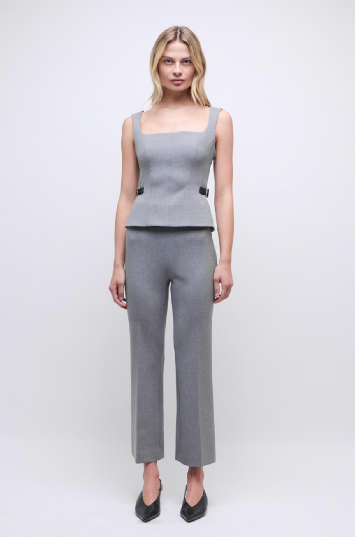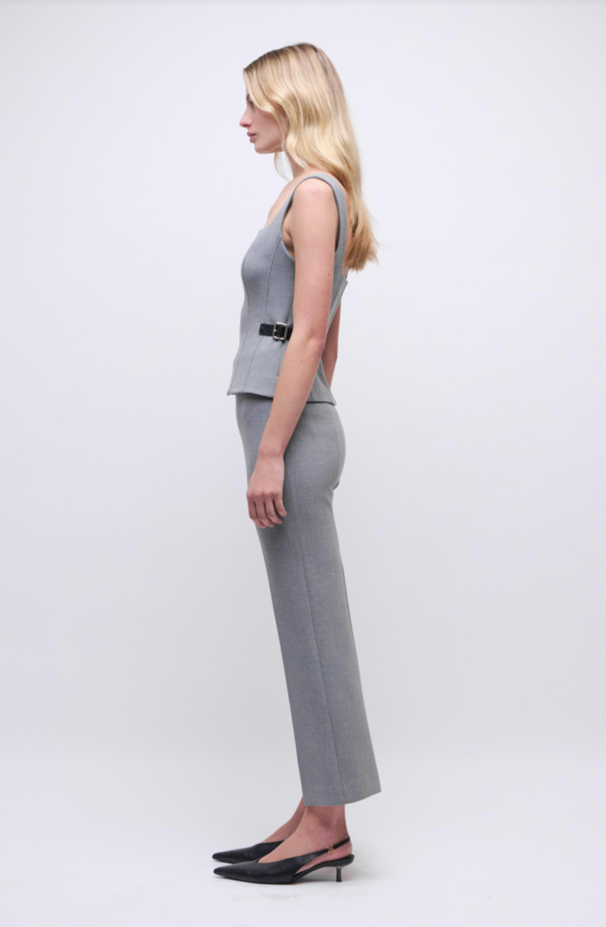 A sleeveless top with vertical contoured seaming and sharp, contrasting belted detailing at the side hip.
