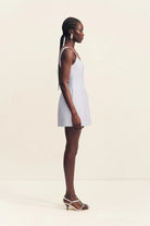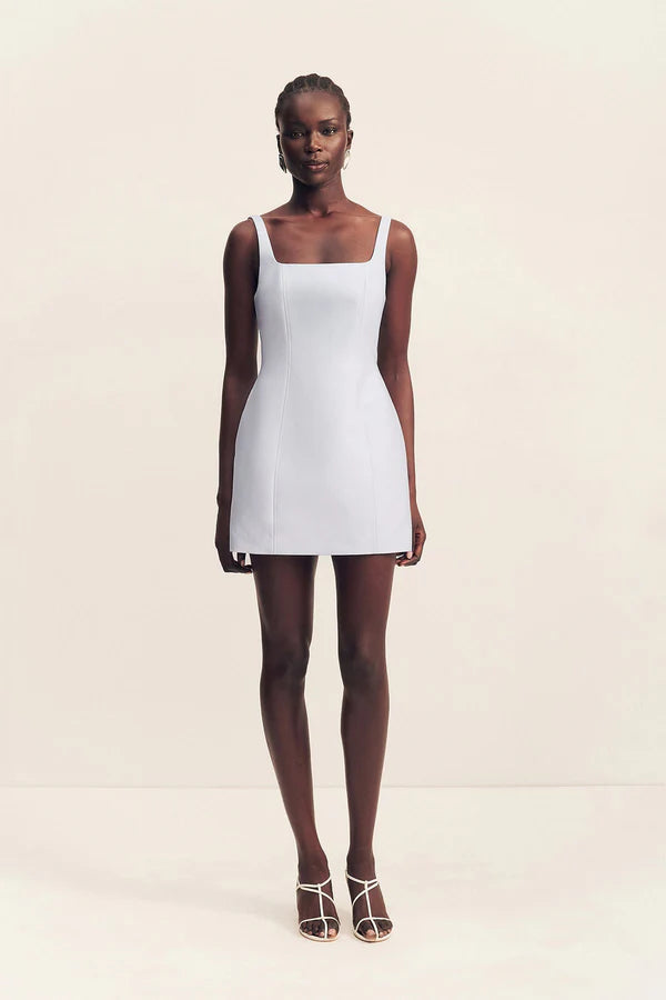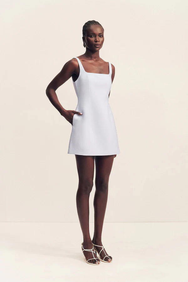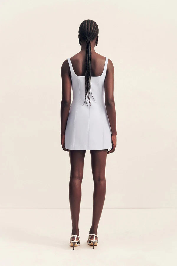 Square neck mini dress in sky in a luxurious cotton sateen blend.