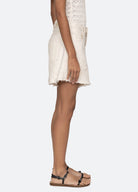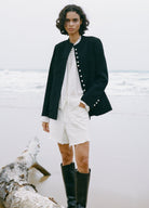The Spencer mended denim shorts feature a relaxed fit with a frayed hem and subtle embroidered detailing, giving them a laid-back yet elevated vibe. These shorts are designed in a classic denim style, perfect for warm-weather wear.
